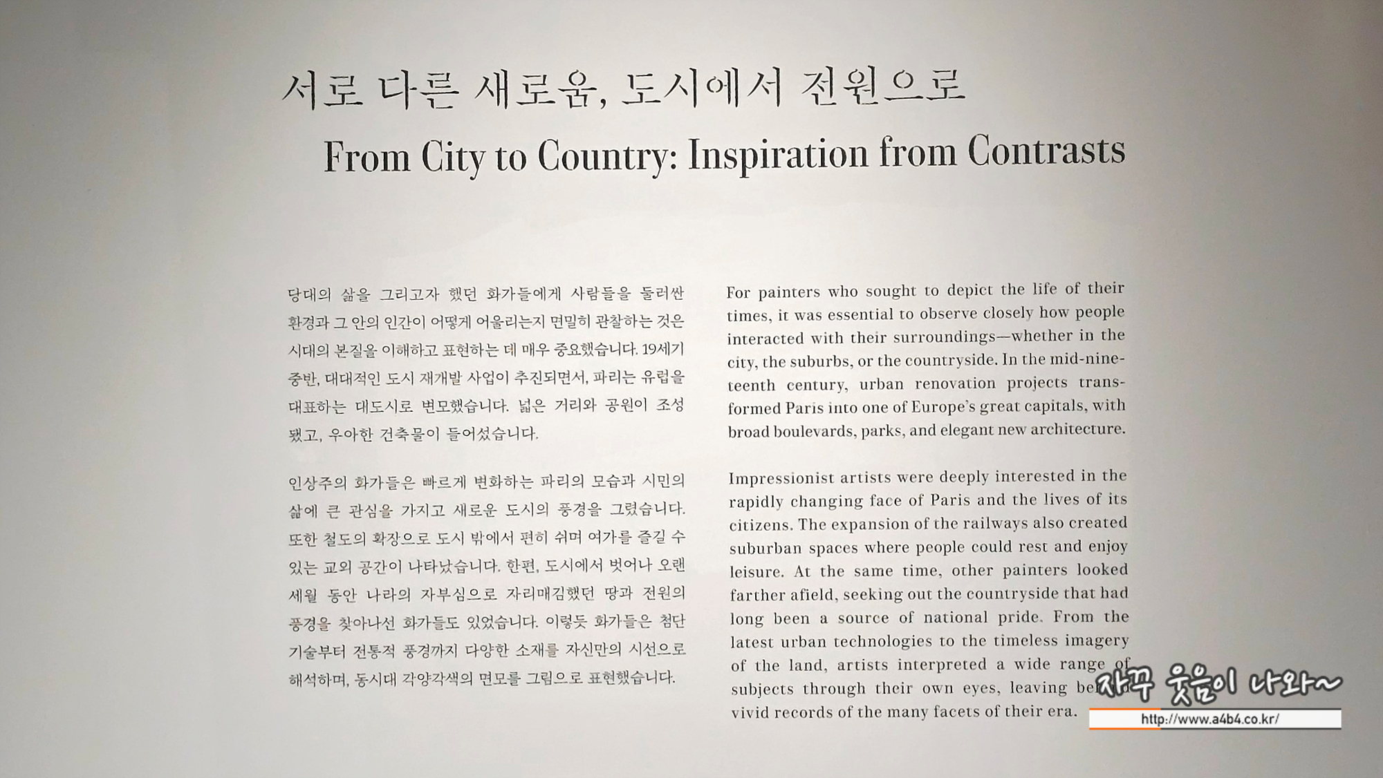 인상주의 화가들은 이 새롭게 변하는 파리와 시민들의 일상에 주목해 도시 풍경을 그렸고, 철도 확장으로 생겨난 교외 휴식 공간 역시 중요한 소재가 되었다. 한편 일부 화가들은 도시를 떠나 오랫동안 국가의 자부심이었던 전원 풍경을 찾아 나섰다. 이처럼 화가들은 첨단 기술에서 전통적 자연까지 다양한 소재를 각자의 시선으로 해석하며, 변화하는 시대의 여러 모습을 그림으로 담아냈다.