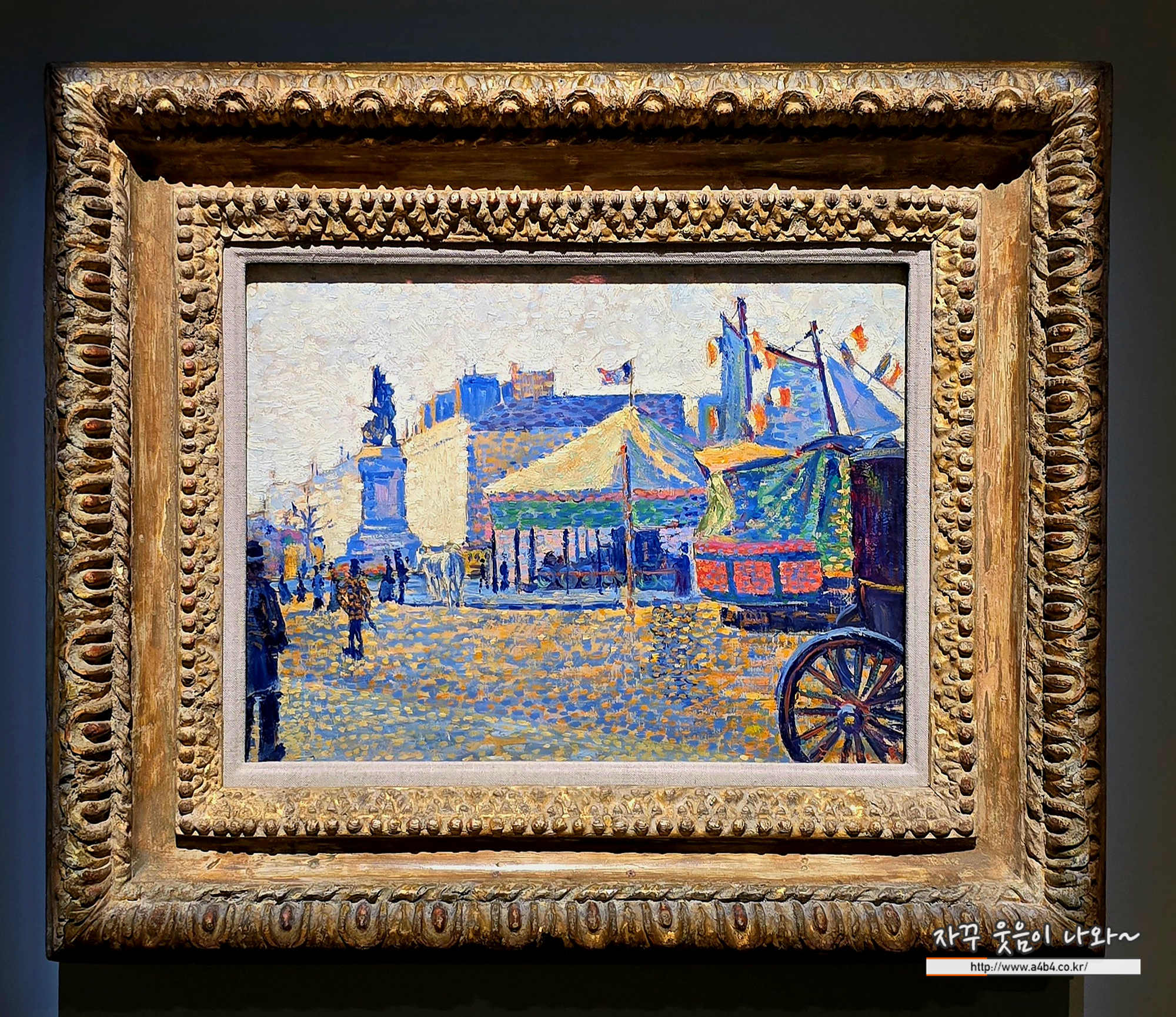 폴 시냐크는 클리시 광장의 한낮, 놀라울 만큼 고요한 순간을 점묘법으로 그렸다. 지역 순회 축제가 열리고 있지만 회전목마는 멈춰 있고, 가판도 덮개가 씌워져 한산한 분위기를 풍긴다. 그는 파랑·노랑, 빨강·초록 등 대조적인 색을 점묘 방식으로 조합해 장면을 구성했다. 햇빛이 닿는 부분과 그림자가 드리운 부분의 강한 대비가 한낮 특유의 분위기를 생생하게 전달한다.