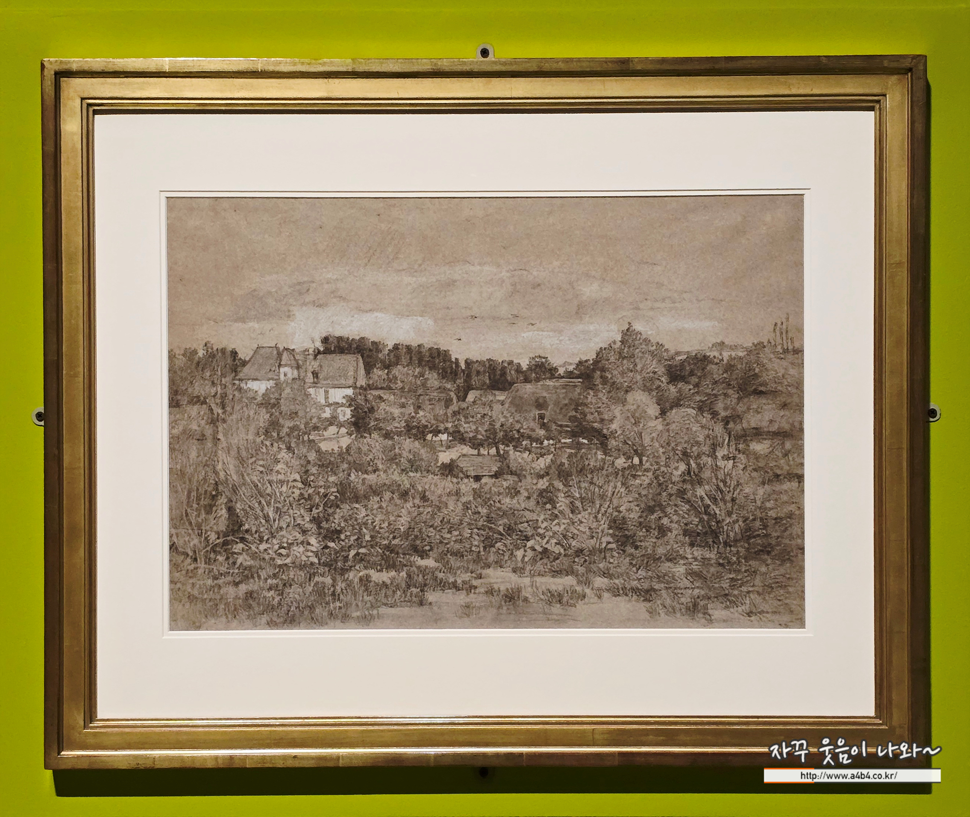 프랑스 풍경화가로, 해변과 바다 풍경을 주제로 야외 사생의 선구자로 인상주의에 큰 영향을 미쳤다. 19세기 후반 외젠 부댕은 고향인 프랑스 북부 노르망디의 풍경을 마을부터 해안까지 다양하게 기록했다. 이 작품은 서명이 없어 정확한 정보는 알 수 없지만, 하늘 표현 방식이 부댕의 초기작과 유사해 그의 작품으로 추정된다. 빽빽한 덤불 사이로 여러 건물이 보이는데, 나무 뼈대와 억새 지붕은 노르망디에서 흔히 볼 수 있는 전통 건축 양식이다. 회색 종이에 검은 분필로 그린 뒤 흰 분필로 세부를 강조했다.