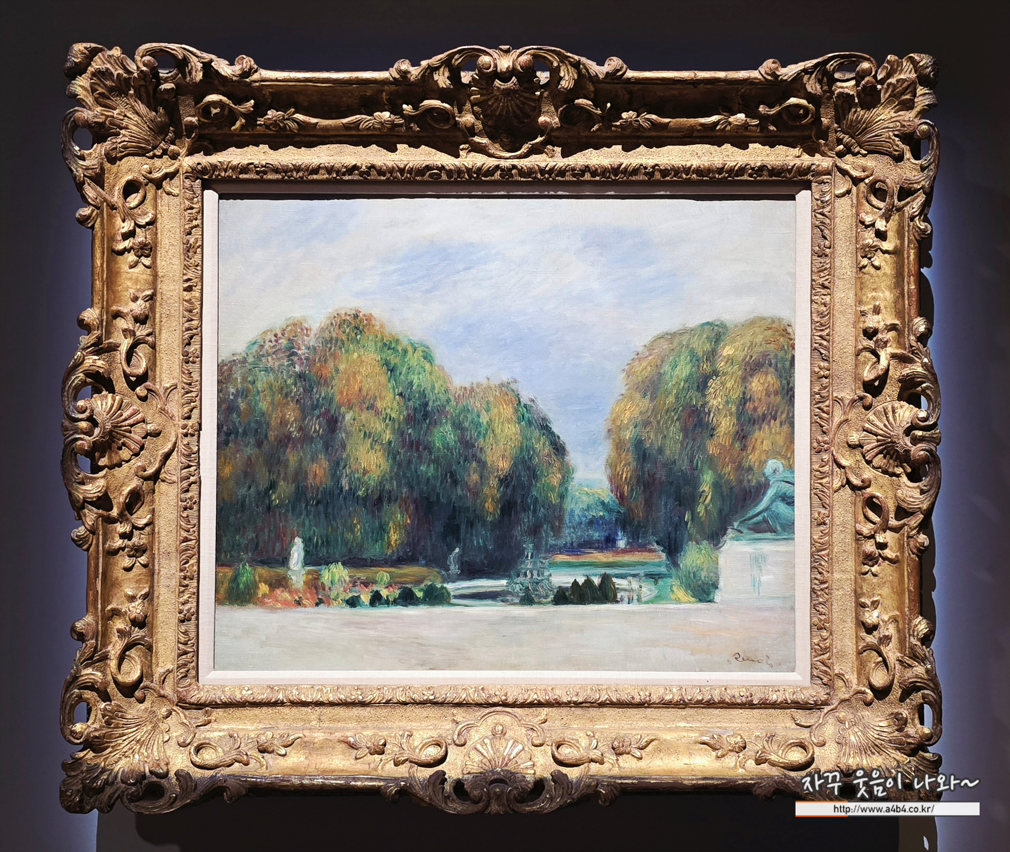 말년의 오귀스트 르누아르는 루이 14세가 세운 베르사유 궁전 정원을 그렸다. 정원을 한눈에 내려다볼 수 있는 지점을 선택해, 가을빛으로 물든 무성한 밤나무 길과 조각상으로 둘러싸인 분수를 담았다. 대리석·청동 조각상들은 정원을 찾은 인물처럼 화면에 존재감을 더하는데, 르누아르는 실제로 조각에도 도전한 바 있다. 풍부한 색감과 부드러운 붓질은 인상주의 특유의 분위기를 가득 채운다.