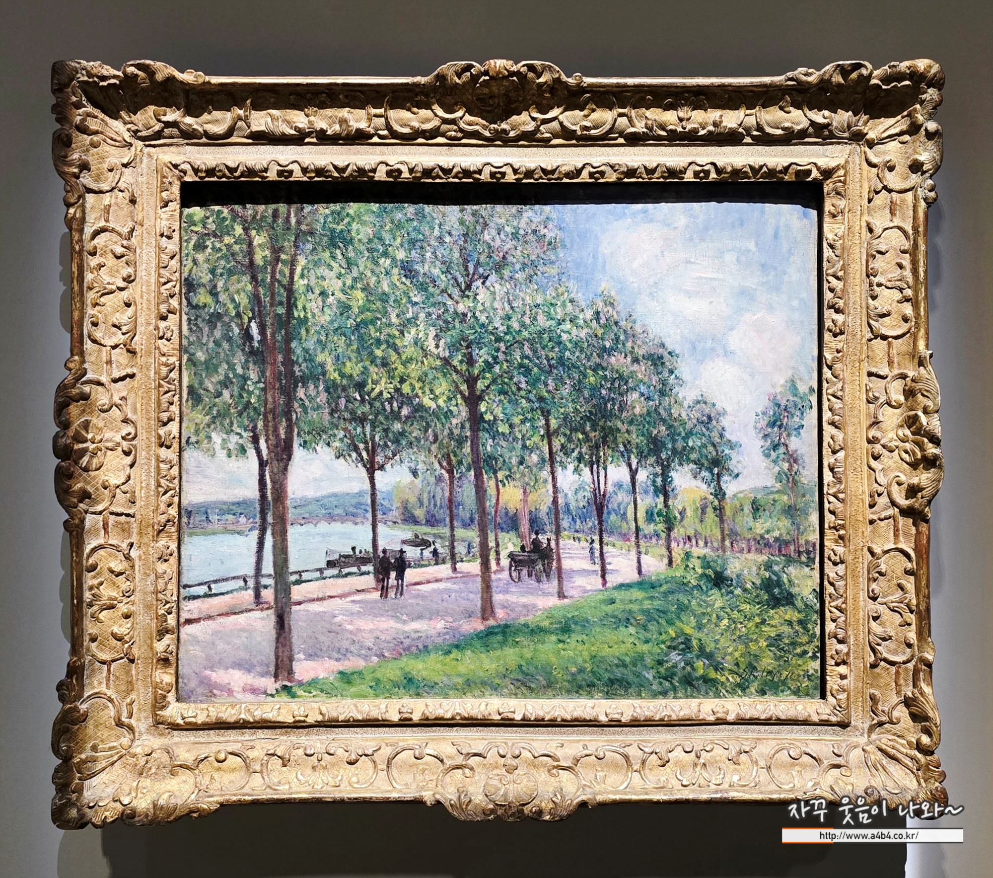 키 큰 나무들이 잎을 무성하게 드리운 채 센강의 굽은 물길을 따라 양쪽 길가에 늘어서 있다. 강가에는 작은 배들이 정박해 있다. 인상주의 화가 알프레드 시슬레는 파리 서쪽 세브르에서 맑은 날, 나무 그늘 아래 산책하는 사람들과 지나가는 마차를 어두운 실루엣으로 묘사했다. 초록 잎 사이곳곳에 찍힌 분홍빛은 나무에 꽃이 피었음을 보여주며, 밤나무의 생태로 보아 늦봄 또는 초여름의 풍경으로 추정된다.