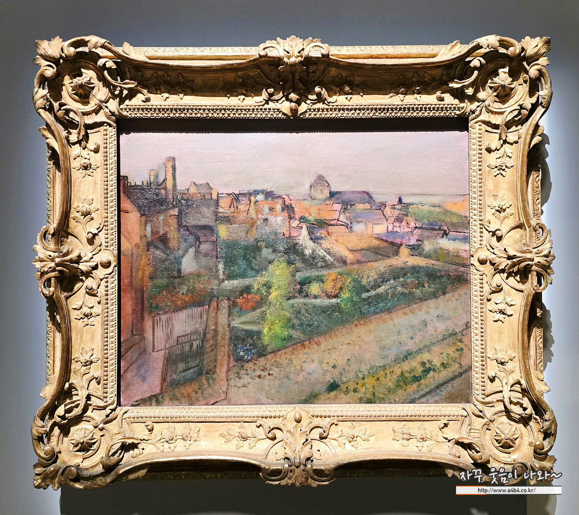 이 작품은 에드가 드가가 그린 프랑스 북부 해안 휴양지 생 발레리 쉬르 솜의 풍경이다. 그는 해안선이나 거리처럼 흔한 구도 대신, 지붕이 보일 만큼 높은 시점에서 내려다보는 방식을 선택했다. 수평선 위로 네모난 교회 종탑이 솟아 있고, 검은 윤곽의 지붕 사이로 이웃집 정원이 드러난다. 고른 빛 아래 펼쳐진 경관은 평화롭게 조화를 이루며, 옅게 칠한 하늘은 캔버스 질감을 그대로 보여준다.
