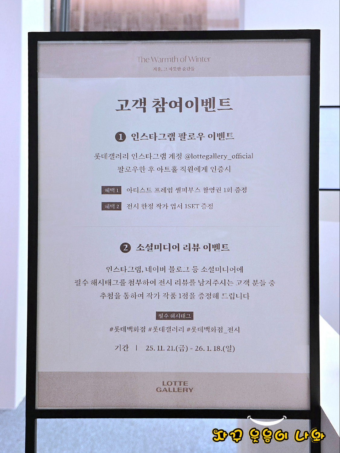이번 롯데갤러리 전시회 겨울,그 따뜻한 순간들 관람하고 인스타그램 이벤트 응모하면, 수빈, 배성규, 아레아레아 작가 작품을 추첨을 통해 소장할 수 있다고 합니다.