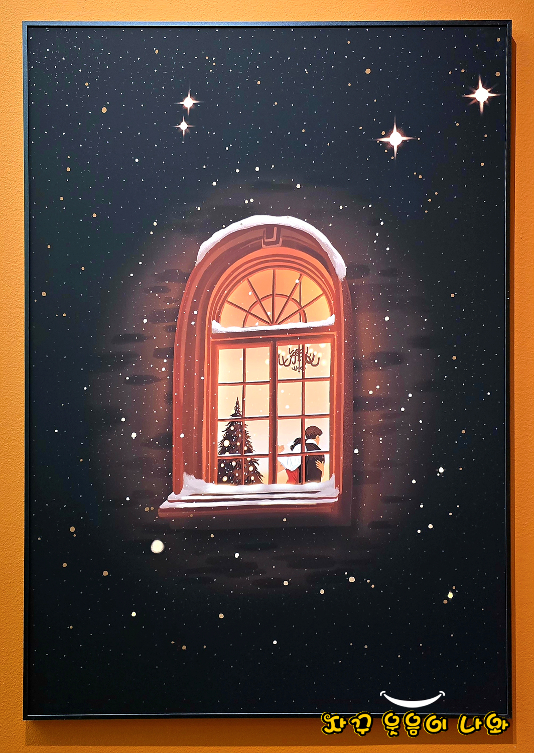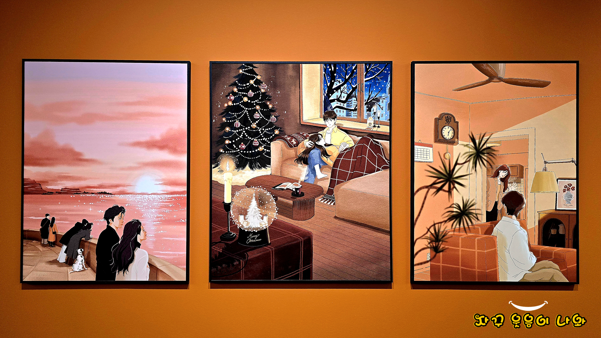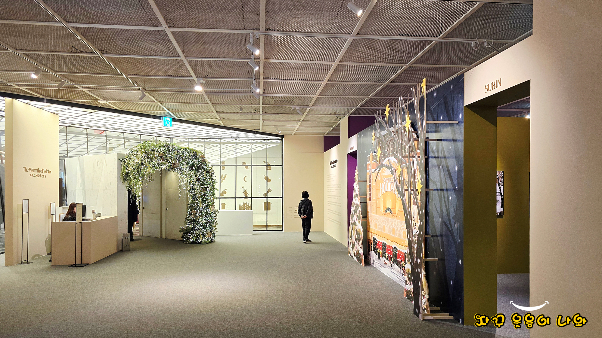 겨울,그 따뜻한 순간들 전시회 전시장 구성은 중앙에 대형 포토월이 설치되어 있고 수빈, 배성규, 아레아레아 작가 3명의 작품이 전시된 각각이 방으로 구성되어 있습니다. 어느 방부터 먼저 들어가도 방은 모두 연결되어 있고요. 배성규 작가 또는, 아레아레아 작가 방에서 시작하시면 연속해서 관람이 가능합니다.
