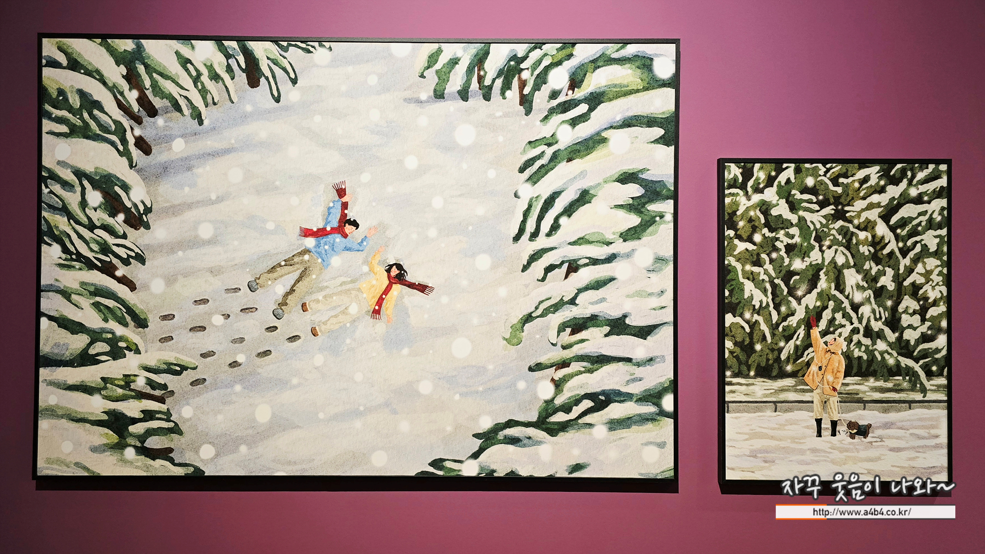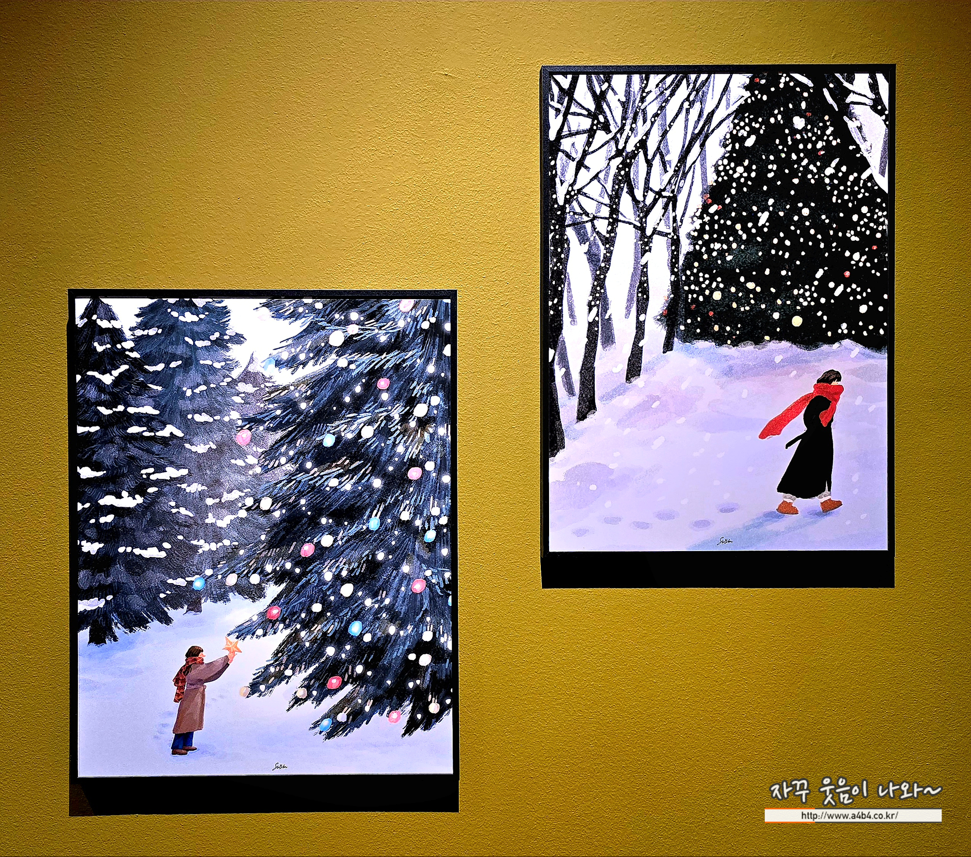 지난주 금요일부터 잠실 롯데월드몰 6층에 위치한 에비뉴엘아트홀 전시회 '겨울,그 따뜻한 순간들' 관람후기 입니다. 이번 전시회는 겨울을 주제로 국내에서 활발하게 활동하고 있는 일러스트레이터 3인의 작품을 만나볼 수 있습니다.