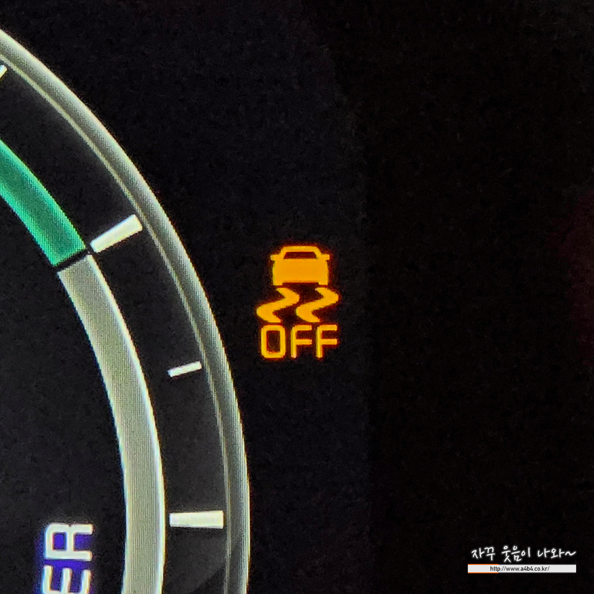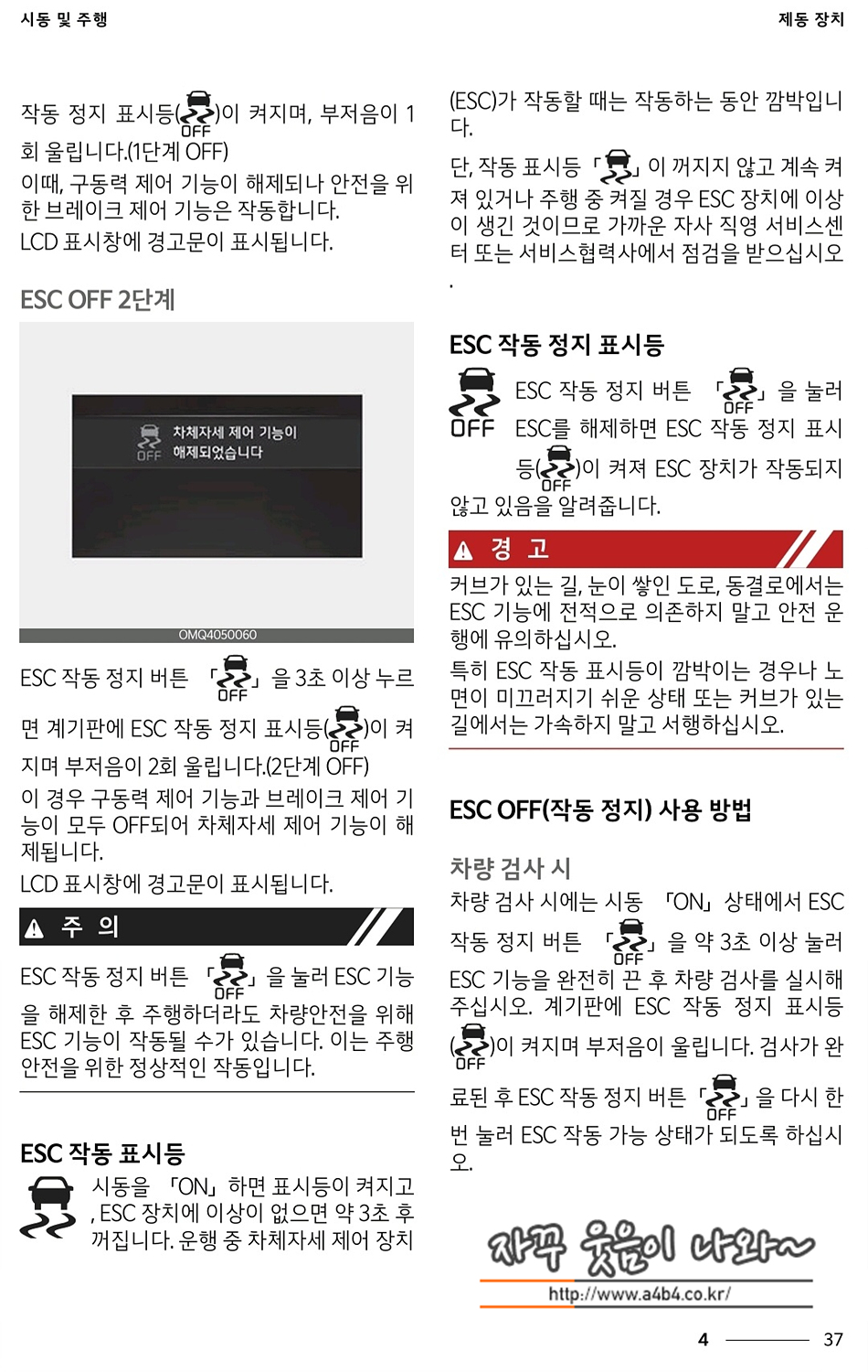 이때, 구동력 제어 기능이 해제되나 안전을 위한 브레이크 제어 기능은 작동합니다.LCD 표시창에 경고문이 표시됩니다.