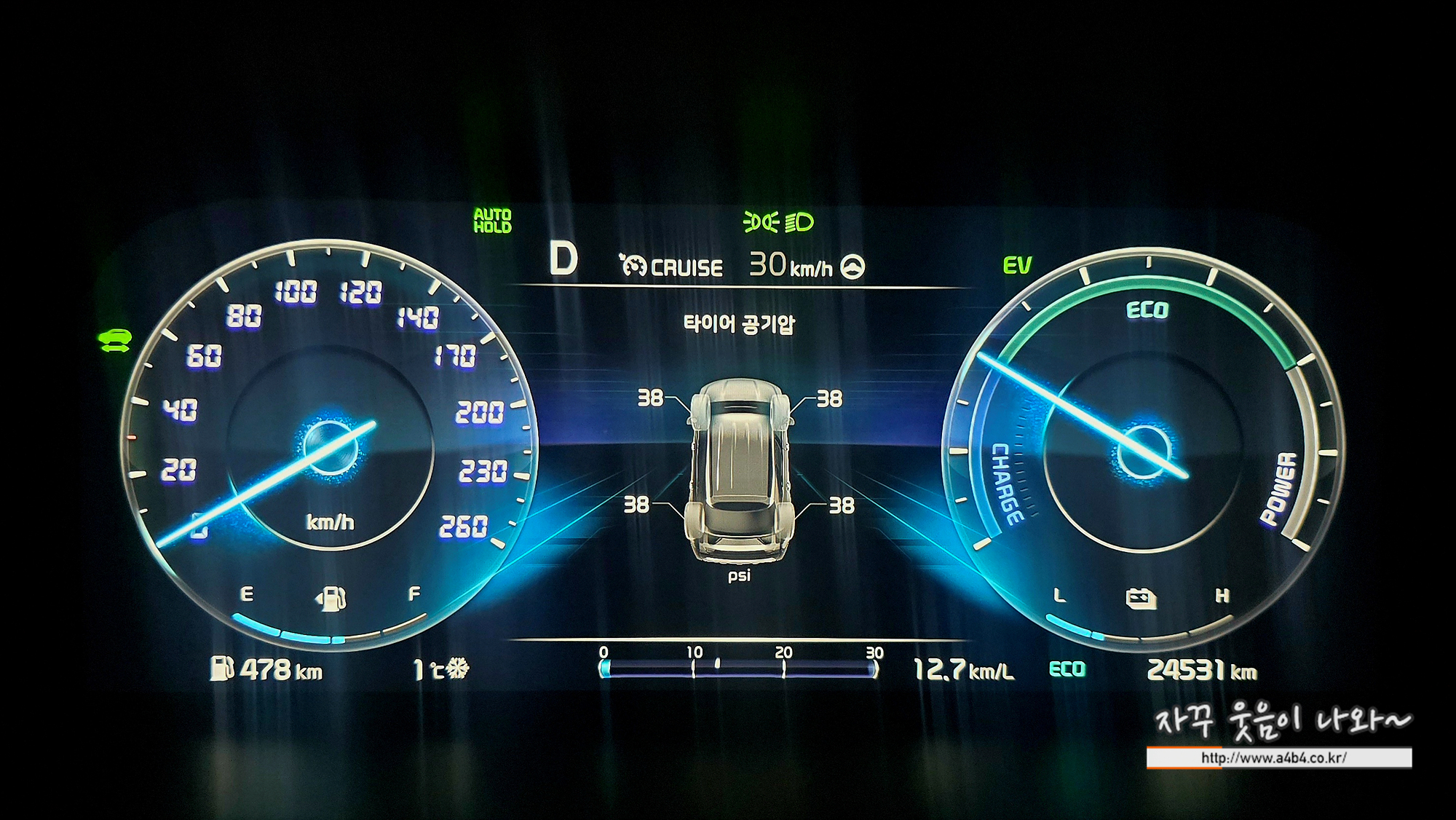2025 쏘렌토 계기판 4륜구동 화면, 상시로 4개의 바퀴에 구동력이 배분되는 것을 확인할 수 있습니다.
