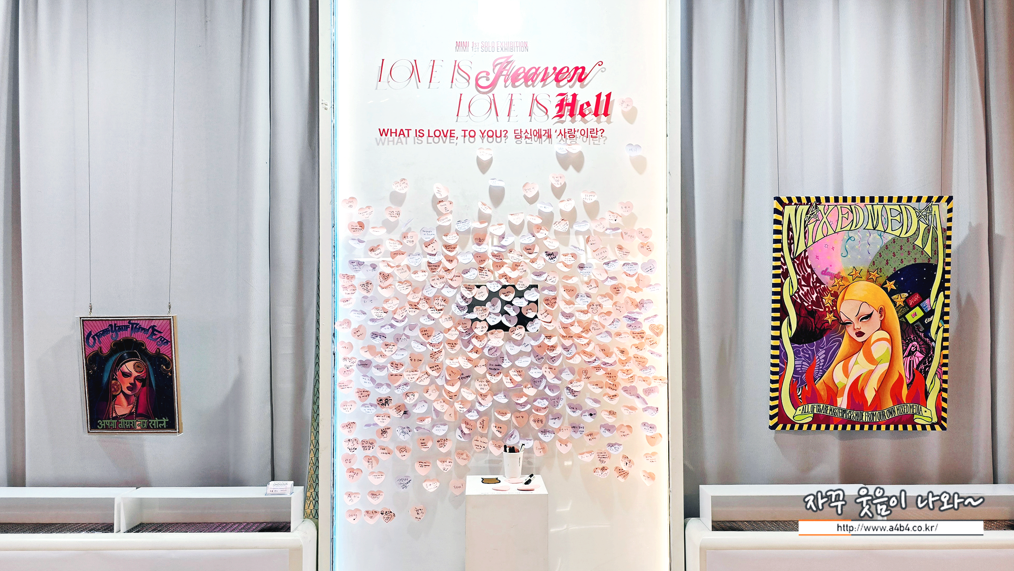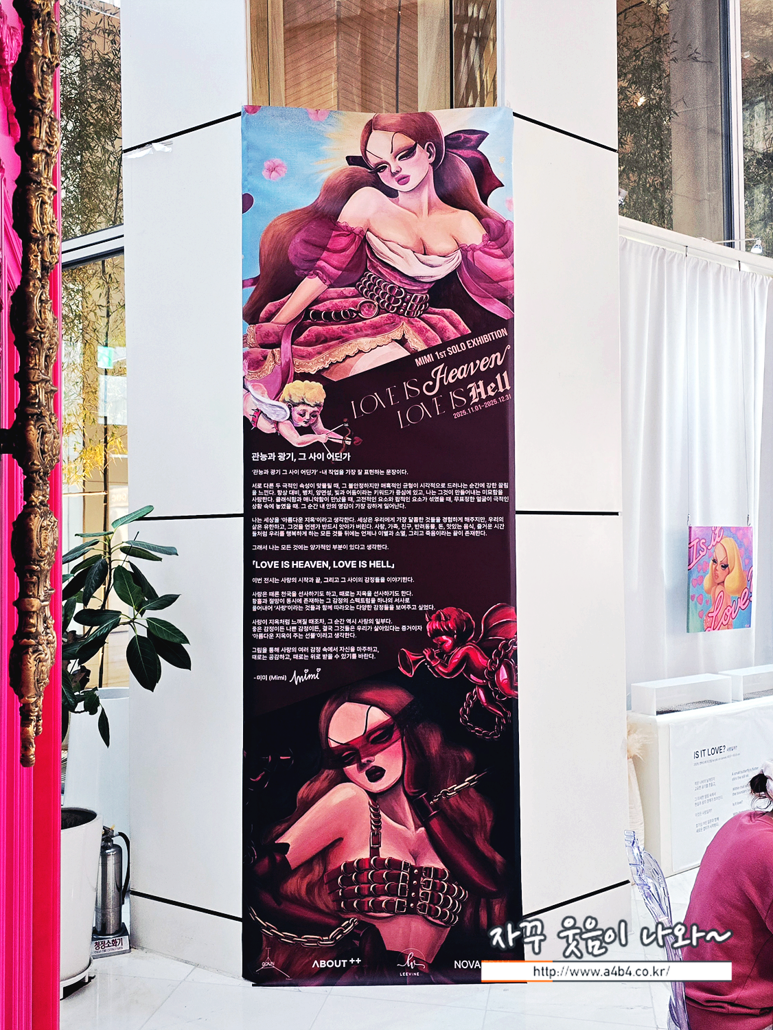 미미 작가, 국내 첫 개인전 'LOVE IS HEAVEN, LOVE IS HELL'이 열리고 있는 어바웃 프로젝트라운지는 카페형 갤러리로 작품 감상에 집중하기에는 다소 무리가 있습니다. 주변 식사하시거나 티타임중이신 분들이 불편하지 않게 이동해야 해서...
