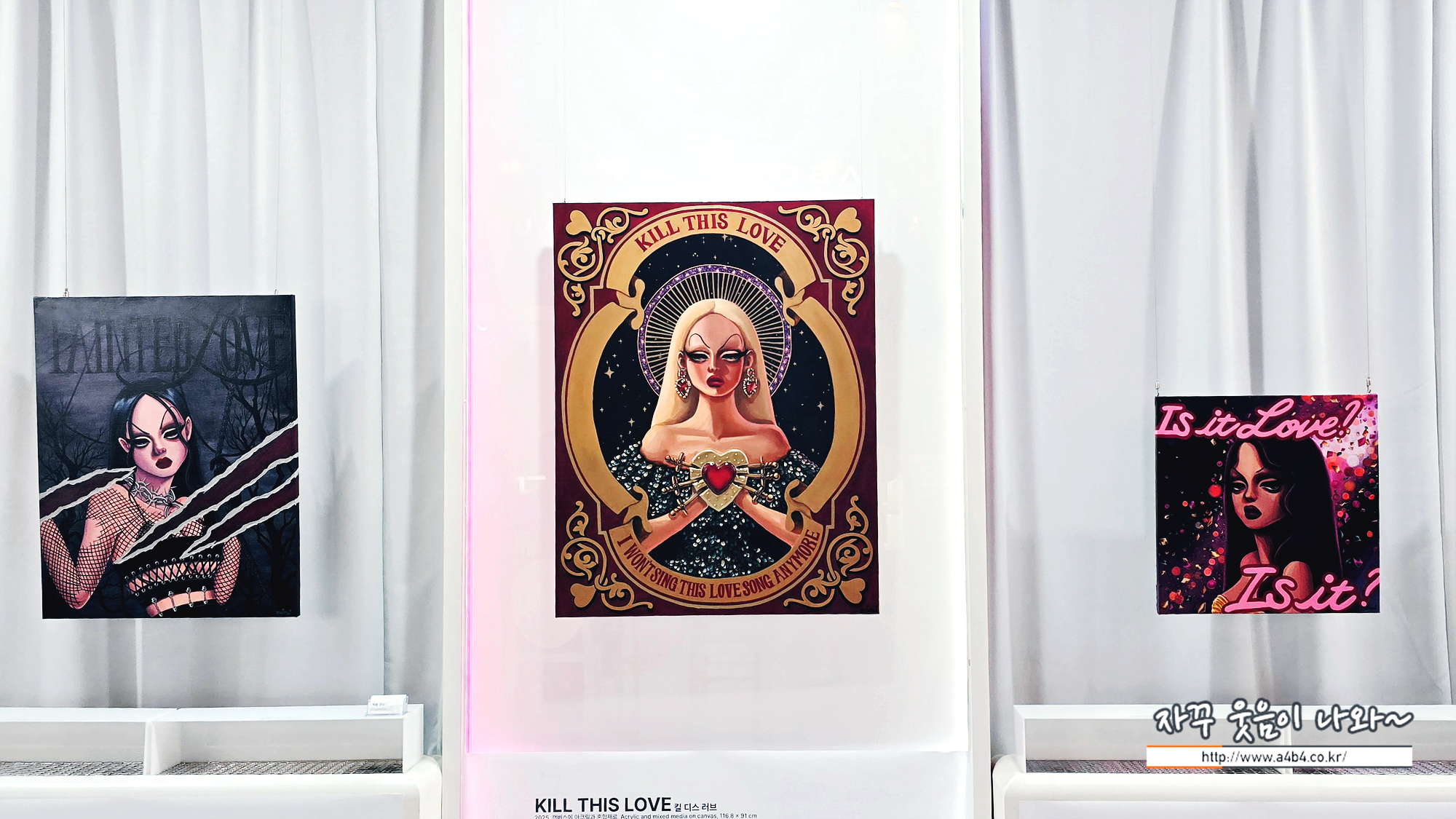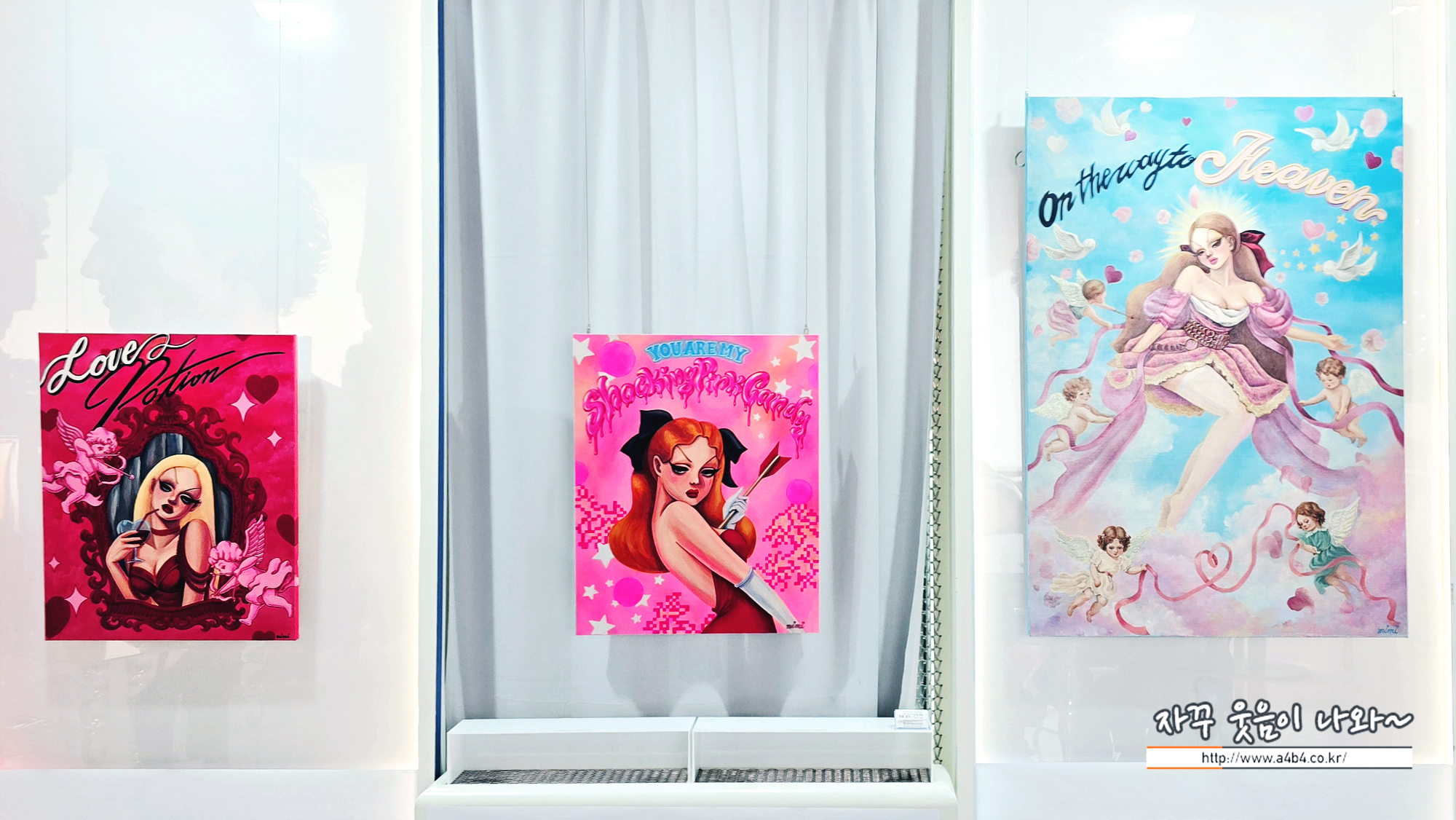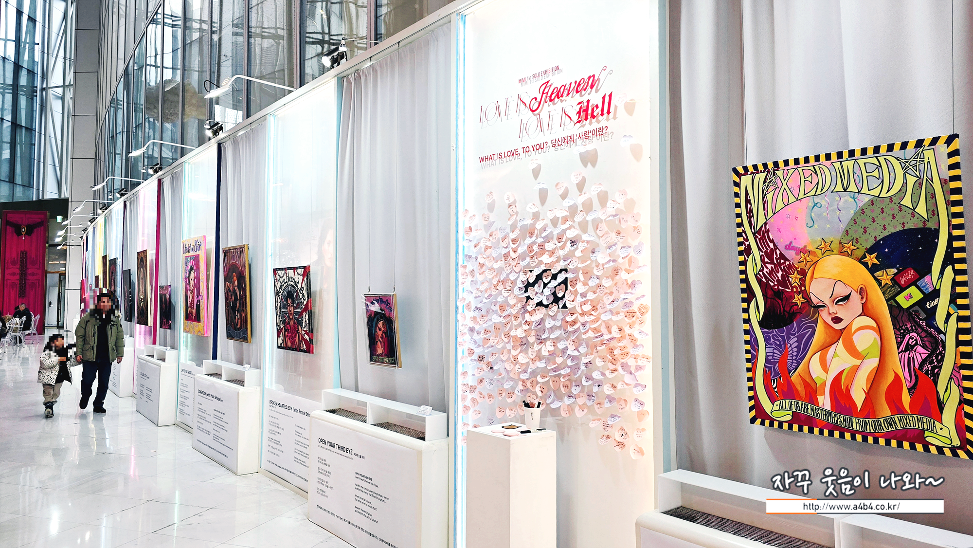 미미 작가, 국내 첫 개인전 'LOVE IS HEAVEN, LOVE IS HELL'이 열리고 있는 어바웃 프로젝트라운지는 카페형 갤러리로 작품 감상에 집중하기에는 다소 무리가 있습니다. 주변 식사하시거나 티타임중이신 분들이 불편하지 않게 이동해야 해서...