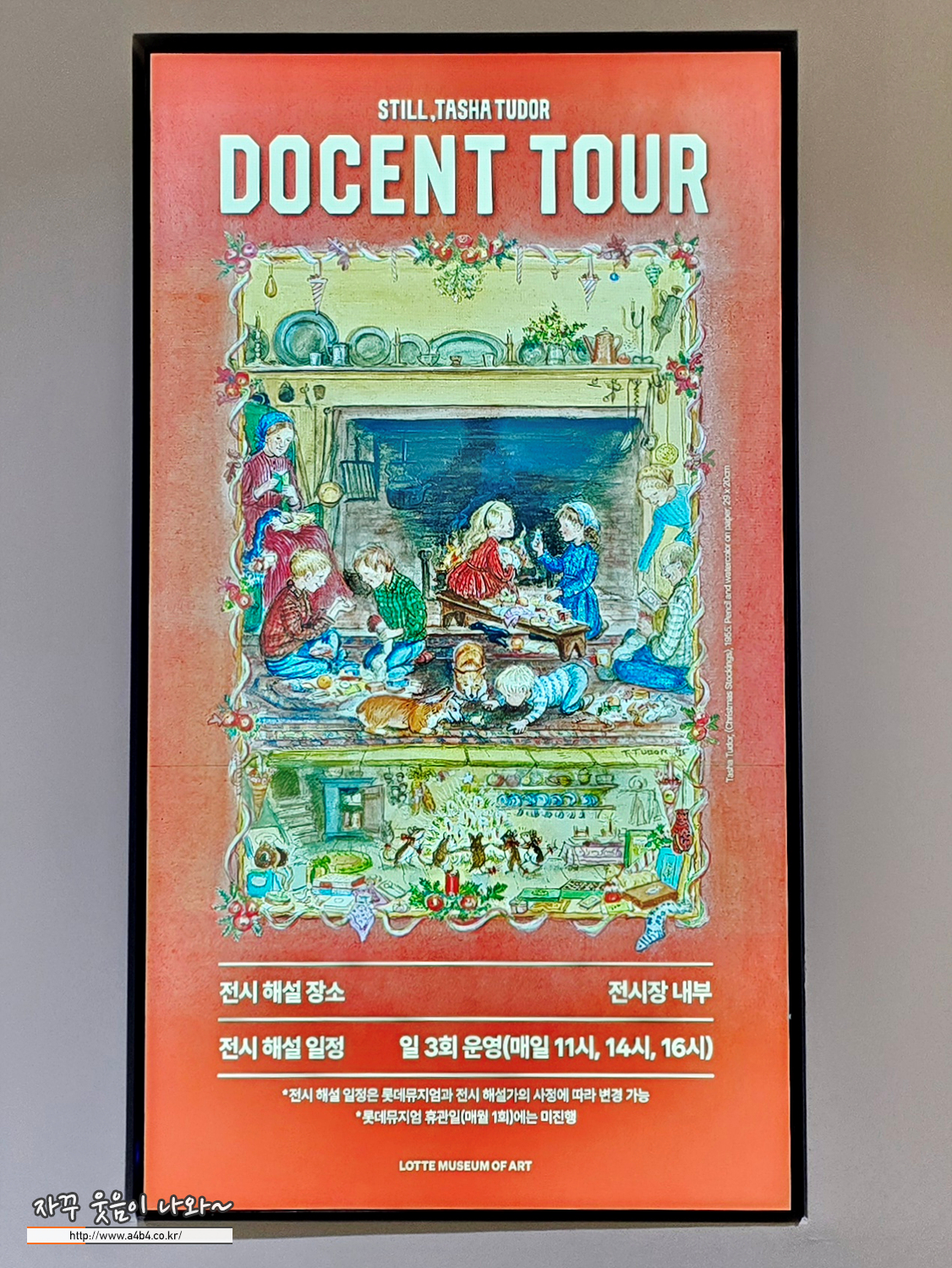 오늘 소개하는 탸샤 튜더 작품전시회는 하루 3번 도슨트가 진행됩니다. 토요일 일요일 공휴일에도 도슨트가 진행되는데요. 이번 전시장에는 작품별 제목을 제외한 추가적인 설명은 없습니다. 오디오가이드도 제공되지 않네요.