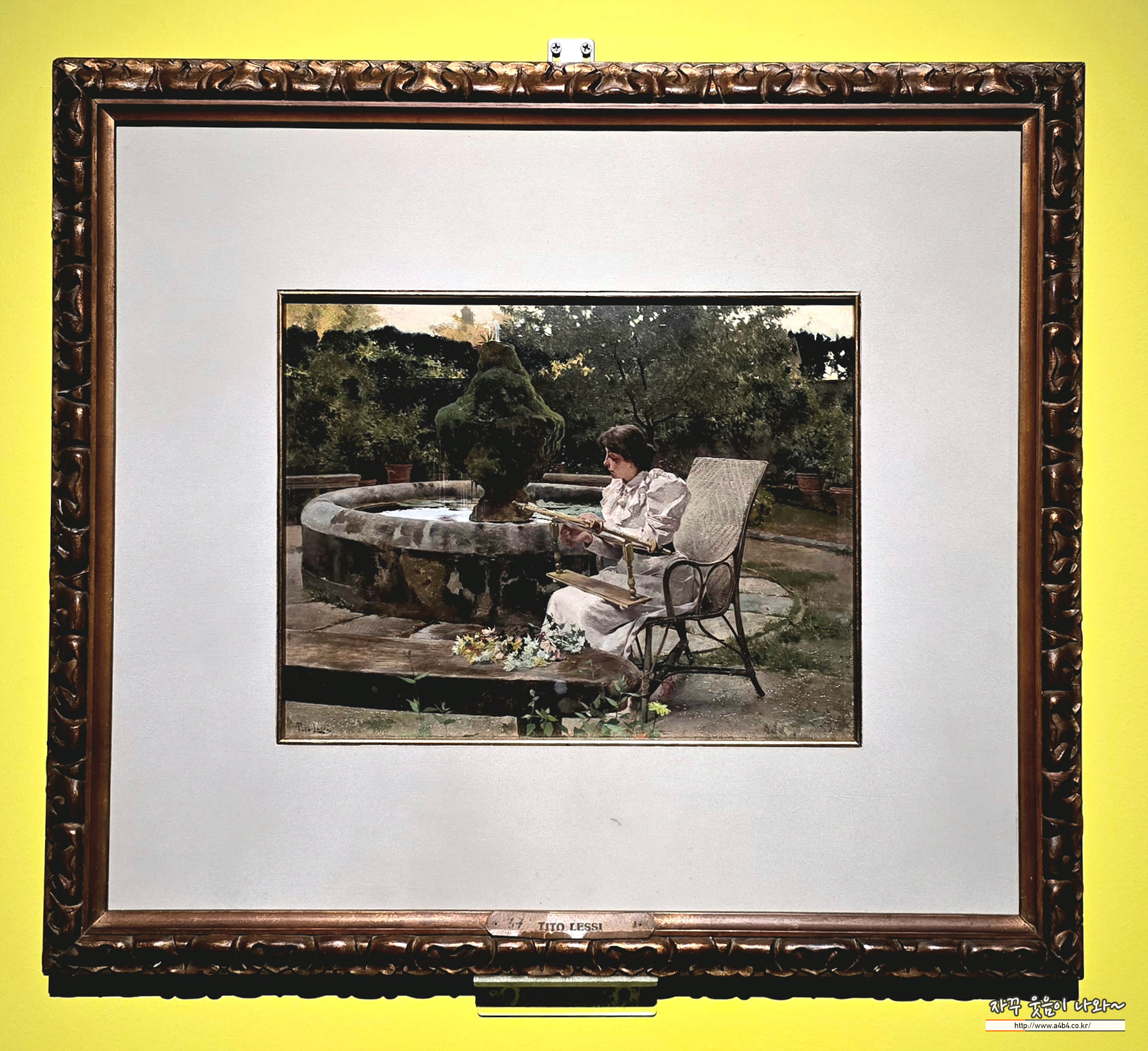 티토 레시는 역사적 주제로 유명한 화가로, 그의 작품 속 여인은 19세기 후반 사실주의 회화에서 자주 등장하는 인물상입니다. 당시 여성들은 집 안이나 작은 정원에서 독서, 자수, 담소 등 일상을 보내며 사색의 시간을 가졌고, 레시는 이러한 순간을 정원의 원형 분수와 푸른 수목을 배경으로 담았습니다.