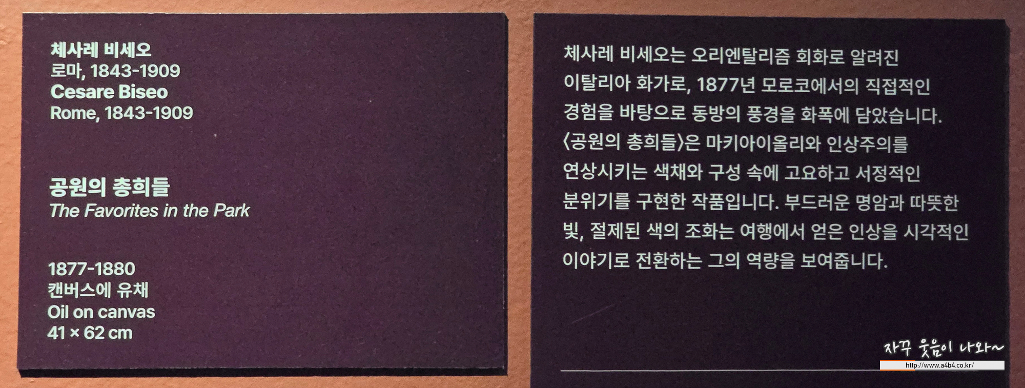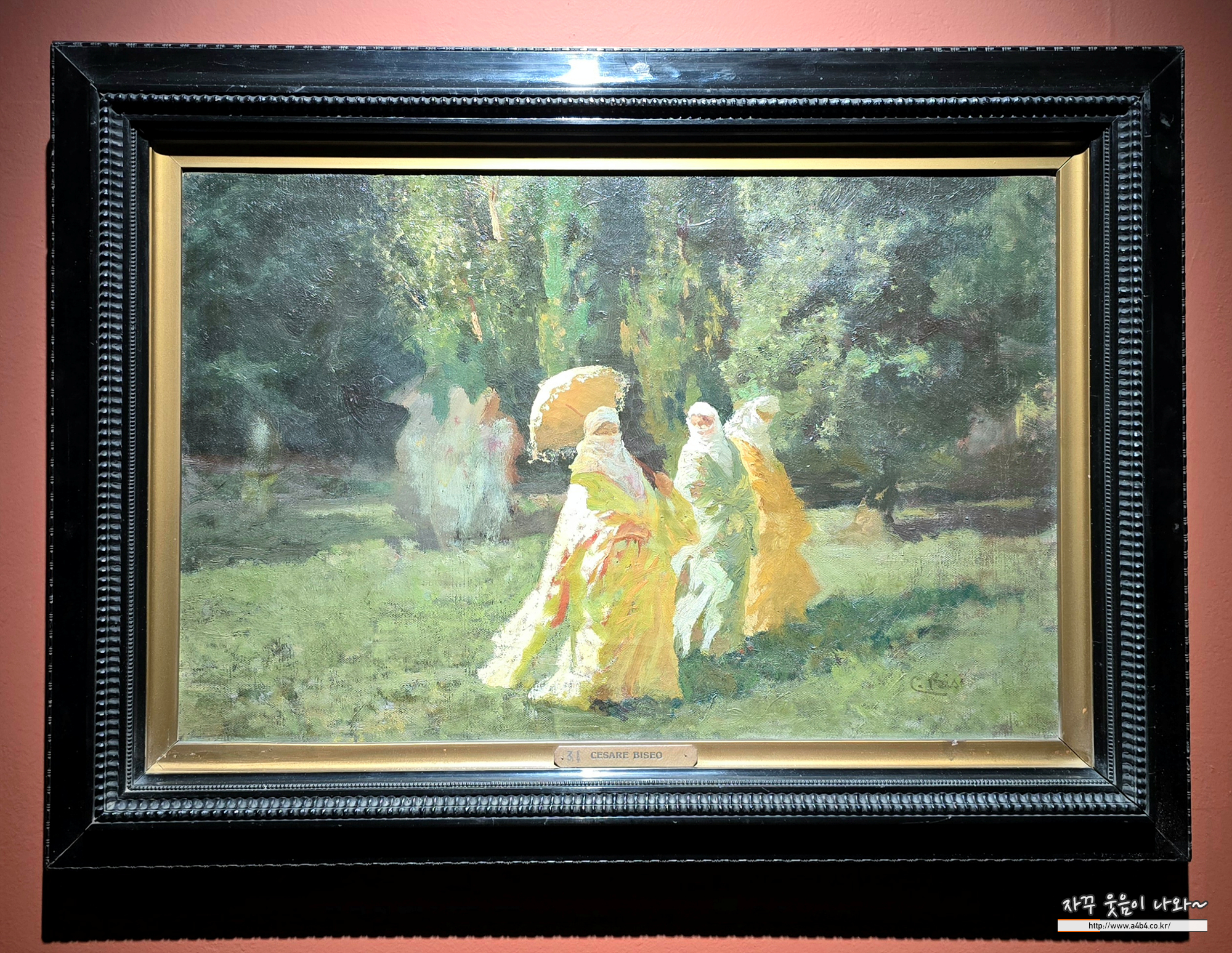 체사레 비세오는 오리엔탈리즘 회화로 알려진 이탈리아 화가로, 그의 작품 '공원의 총희들'은 1877년 모로코 외교 사절단에 동행하며 얻은 경험을 바탕으로 제작되었습니다. 공원에서 산책하는 여인들의 모습을 부드러운 빛과 명암으로 묘사했고, 이탈리아 마키아이올리 양식과 인상주의 감각이 조화를 이룹니다.