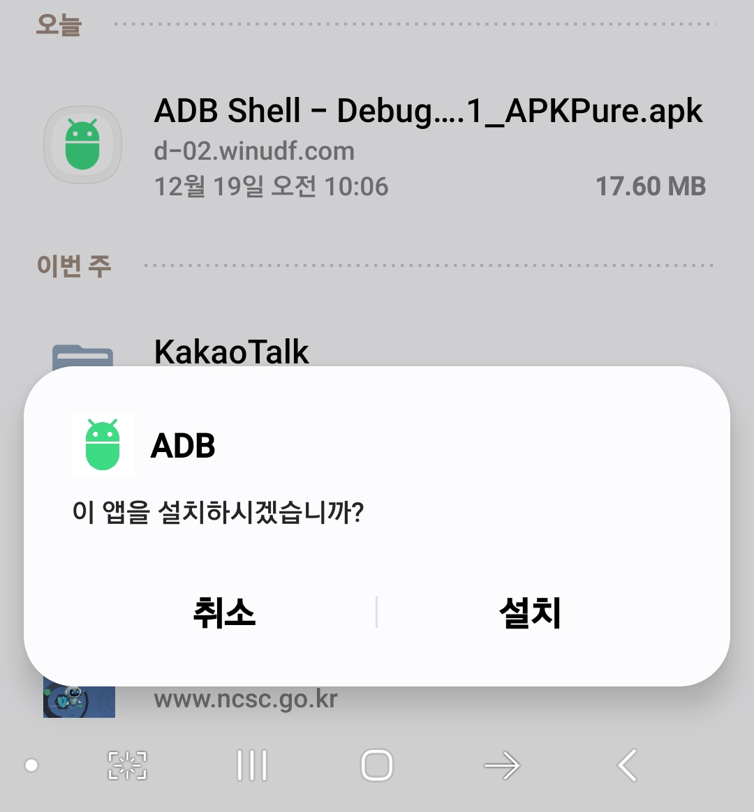 adb Shell 설치를 위해서는 설정 > 보안 및 개인정보 보호 > 보안위험 자동 차단 기능을 해제하셔야 합니다.