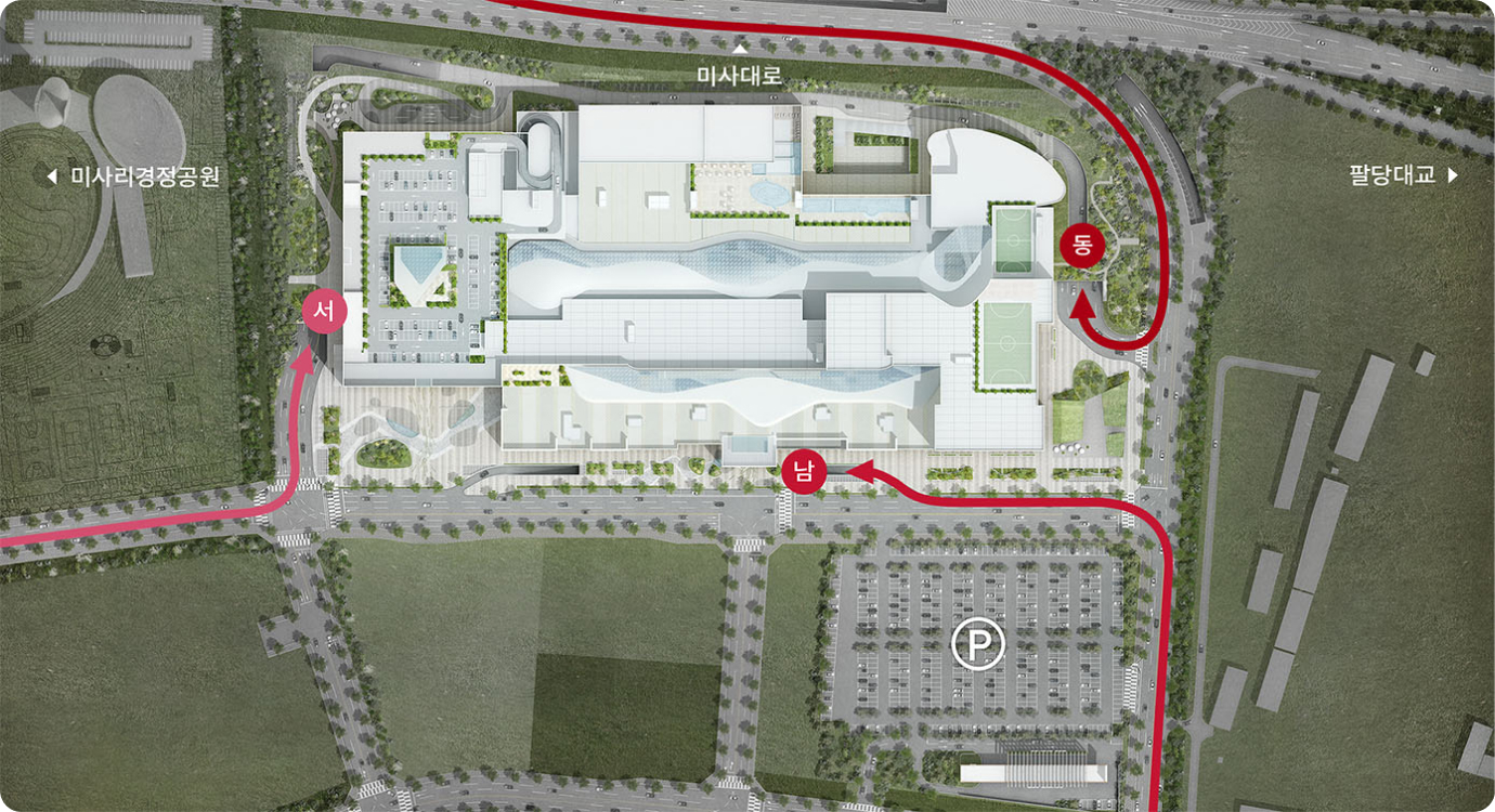 하남IC 방면 남측 진입로와 상일IC 방면 서측 진입로는 지하 주차장으로만 연결되어 있고요.