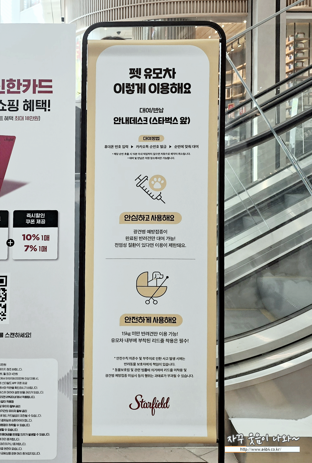 스타필드 펫 유모차 대여조건은 예방접종 완료한 15kg 미만의 중소형견만 이용이 가능합니다. 개모차는 중형 개모차가 대여되는데요.