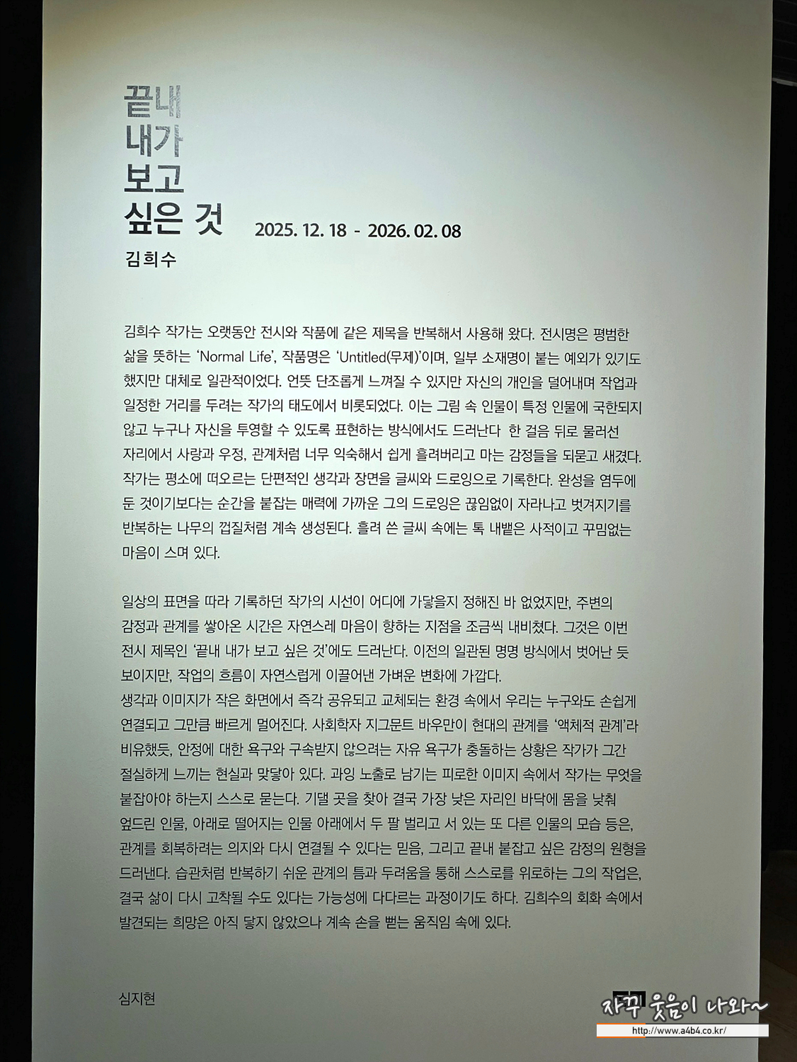 전시장 안쪽 단독으로 전시되어 있는 작품 하나, 이번 끝내 내가 보고 싶은 것 김희수 작가 전시회 홈페이지에 있는 대표 작품 중 하나네요.