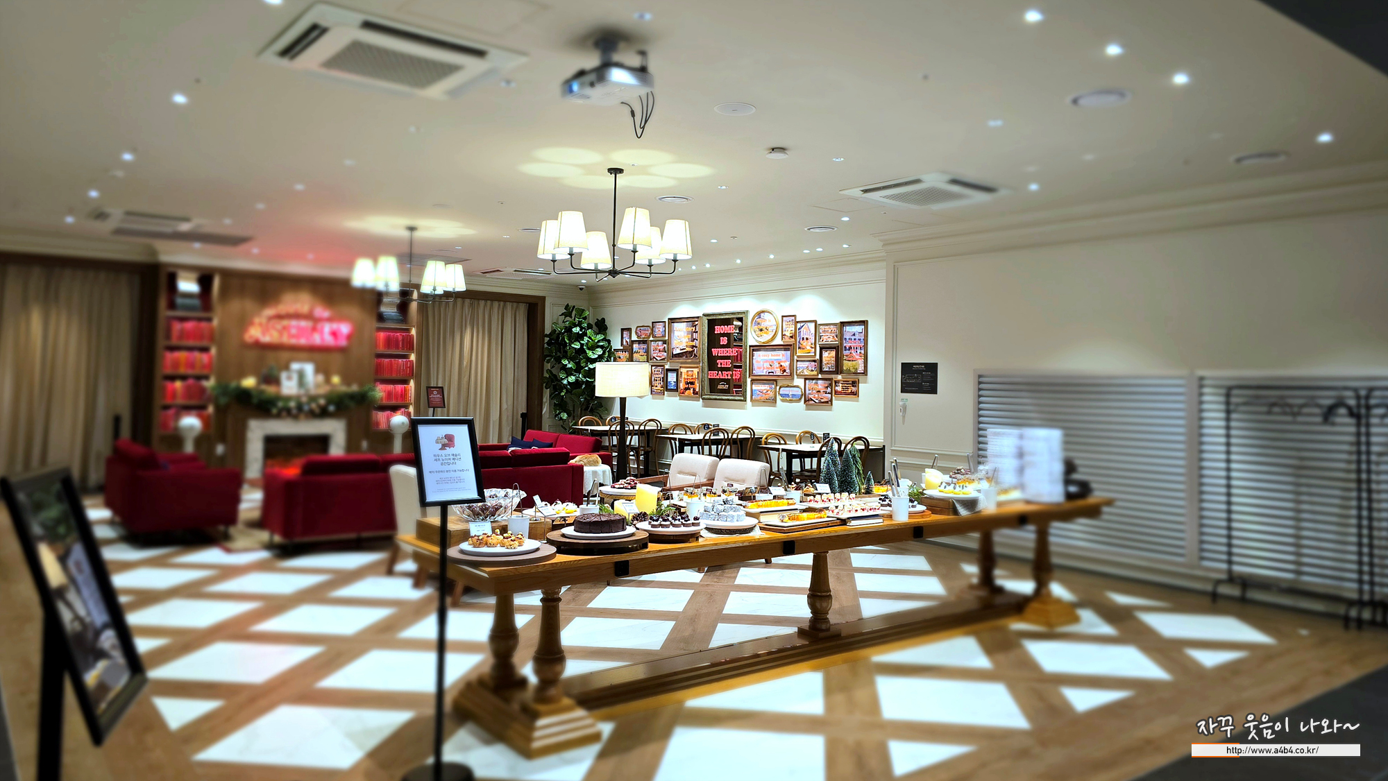애슐리 디저트 뮤지엄 로비입니다. 로비를 주변으로 식사 테이블이 배치되어 있고. 중간 중간에 별도 휴식 가능한 쇼파와 테이블이 세팅되어 있습니다.