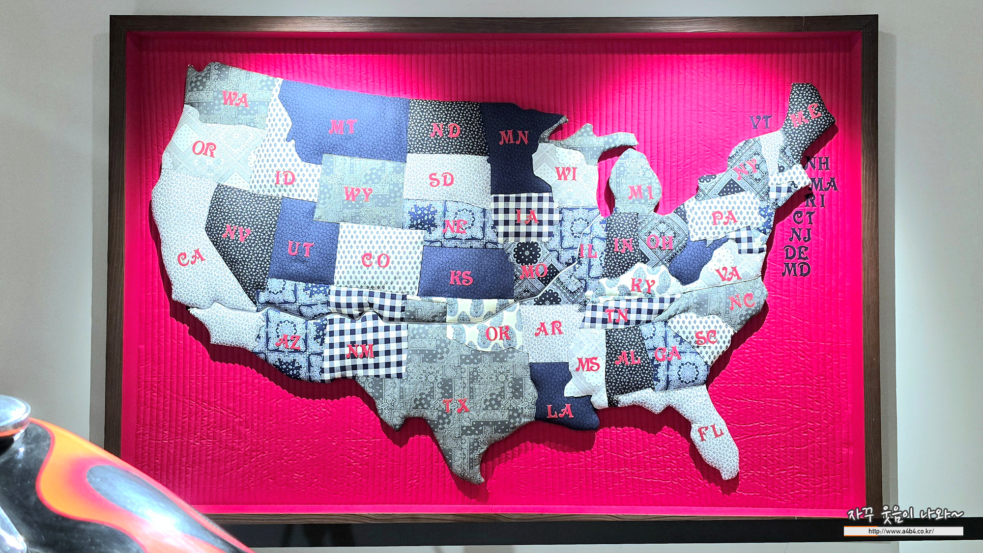 퀼트로 만든 미국 지도와 함께 미국 각 주의 오토바이 번호판이 전시되어 있습니다.