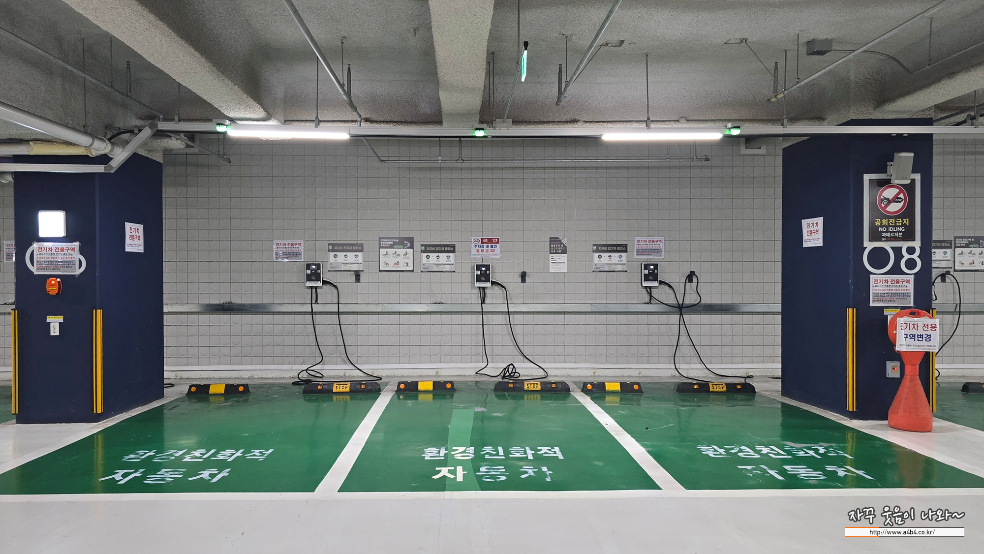 주차장은 깨끗하게 잘 관리되고 있고요. 지하 2층 기준 한쪽에는 전기차 충전소, 반대쪽에는 일반 주차공간이 마련되어 있습니다. 환경친화적 자동차 공간은 보통 하이브리드 차량 주차도 가능한데, 전기차 중전소로 표시되어 있어 다소 혼란스럽네요.