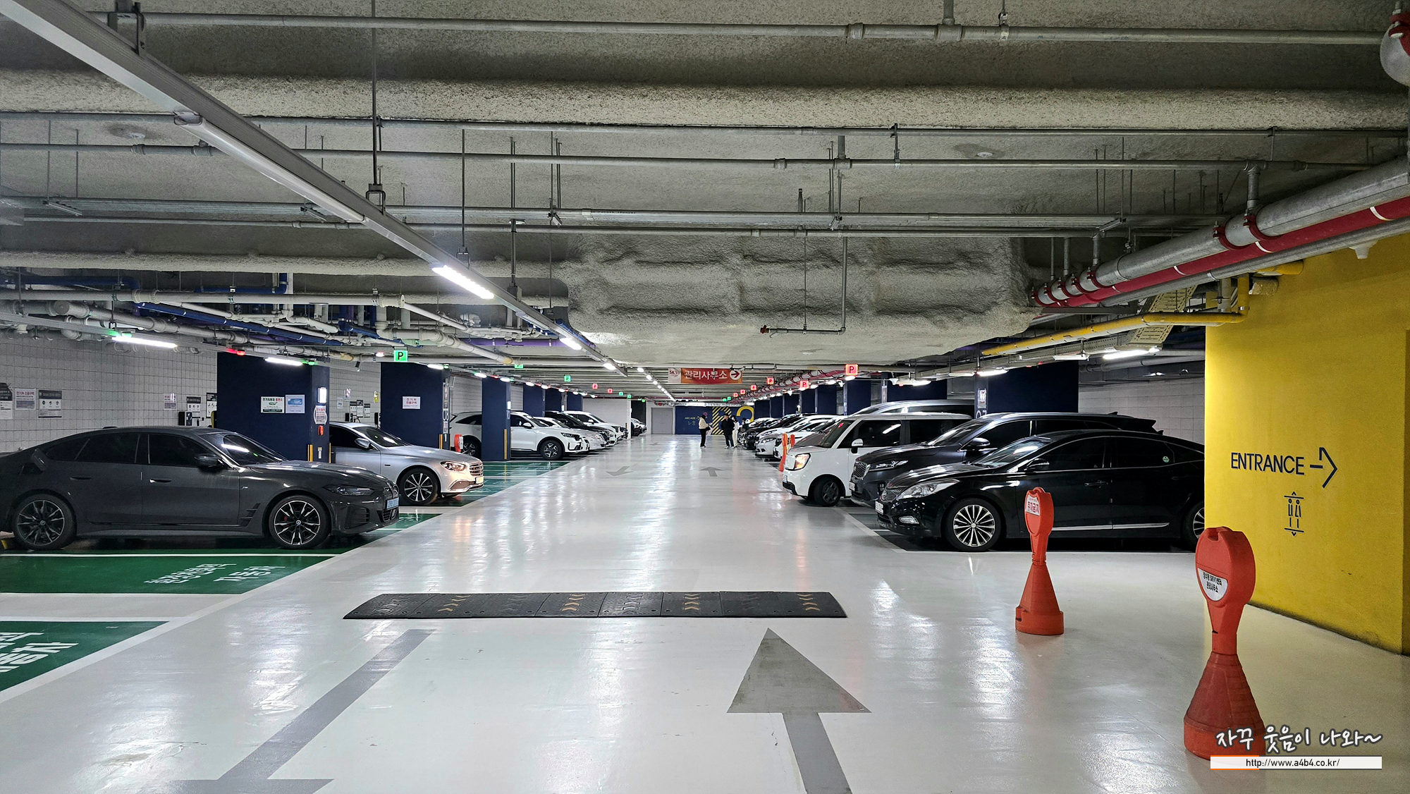 건물 뒷편에 주차장 입구가 있고요. 주차잔 진출입로는 폭이 좁거나 급경사 급커브가 있지는 않습니다. 왕초보가 아니라면 주차장 진출입에 큰 어려움은 없습니다.