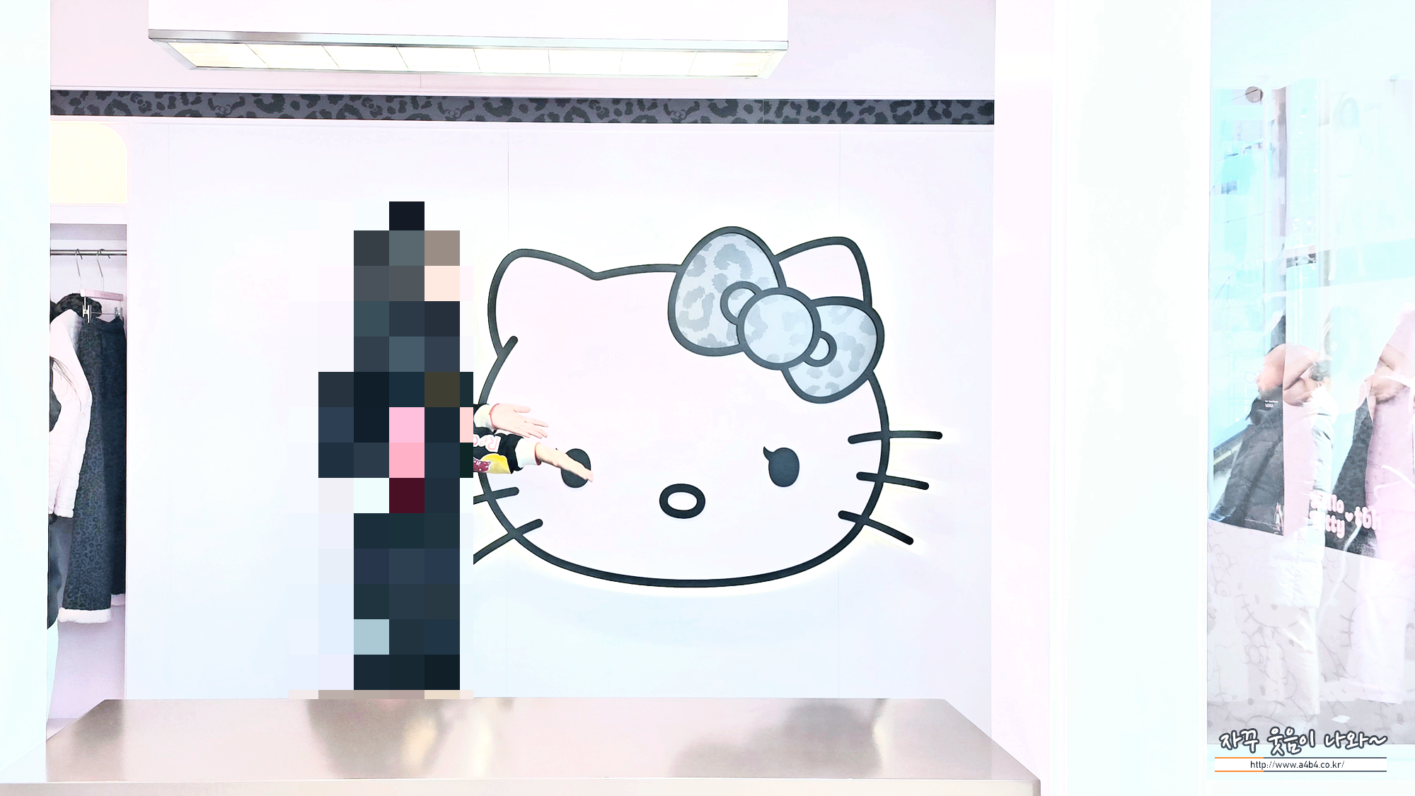 레오파드 무늬 핀을 낀 거대한 키티와 함께 사진 한장... 이곳이 성수 TBH 키티 팝업스토어 인기 있는 포토존 중 하나입니다.