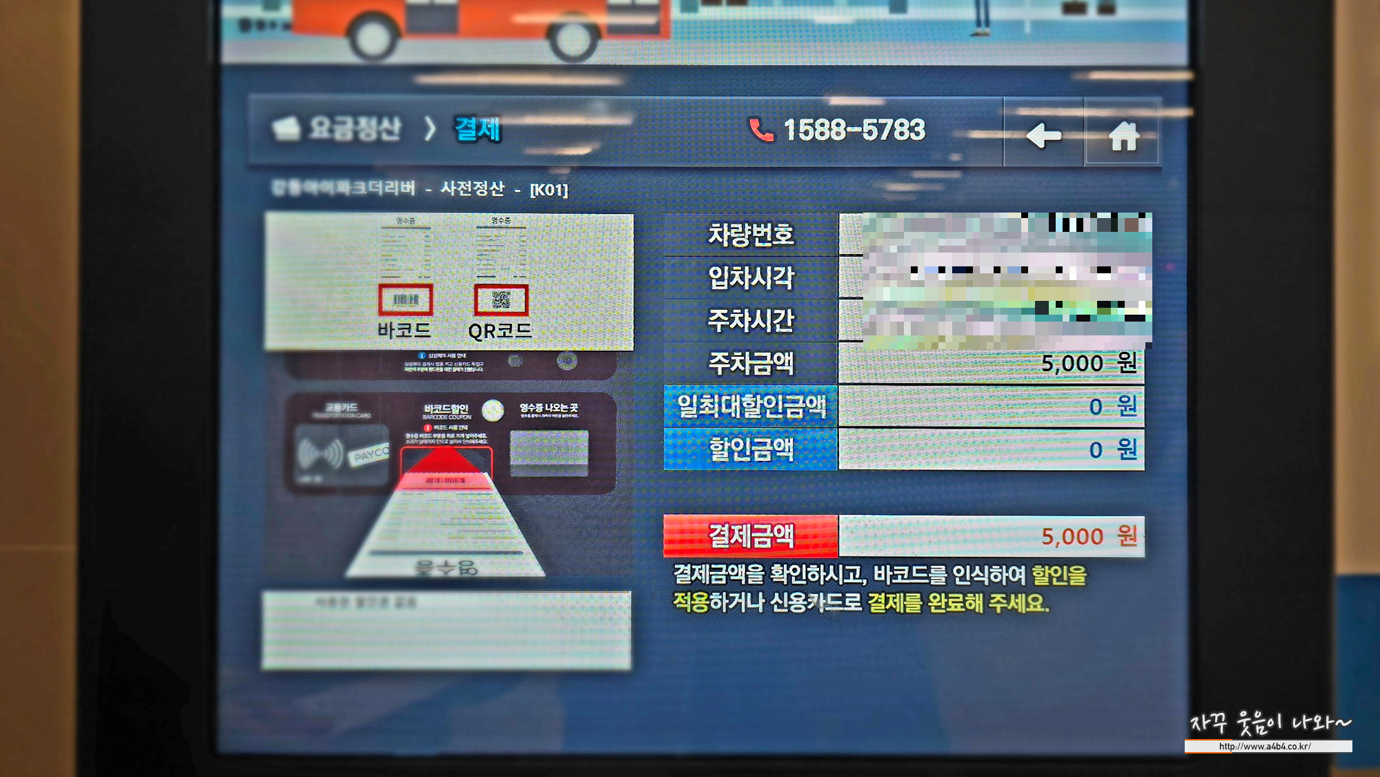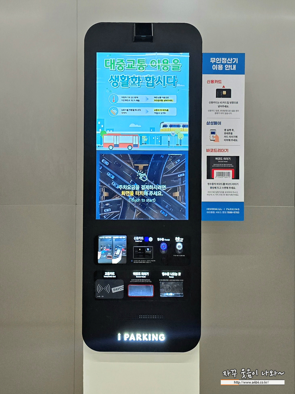 주차요금 정산기 하단에 영수증 바코드 인식하면 무료주차 정산됩니다.