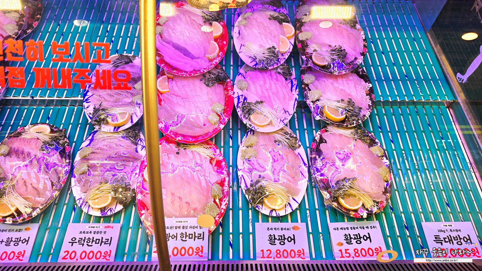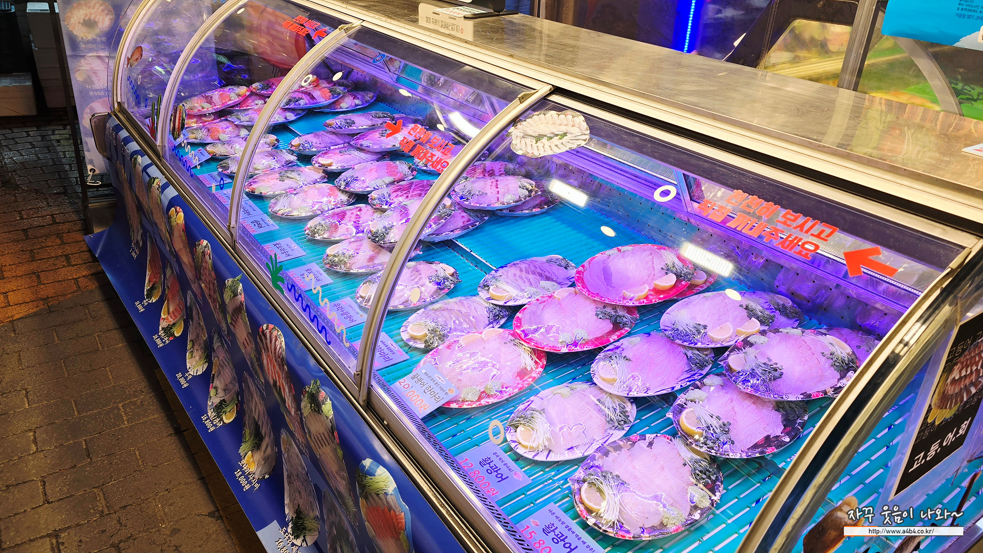 매장안에 식사할 수 있는 공간은 없습니다. 회포차 오지다는 이곳 아닙니다. 이곳은 실내에 수족관과 계산대만 있는 방이시장 내 횟집입니다.