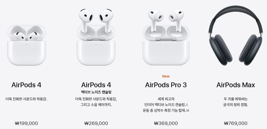 현재 판매중인 애어팟 제품은 총 4개 제품이 있습니다.