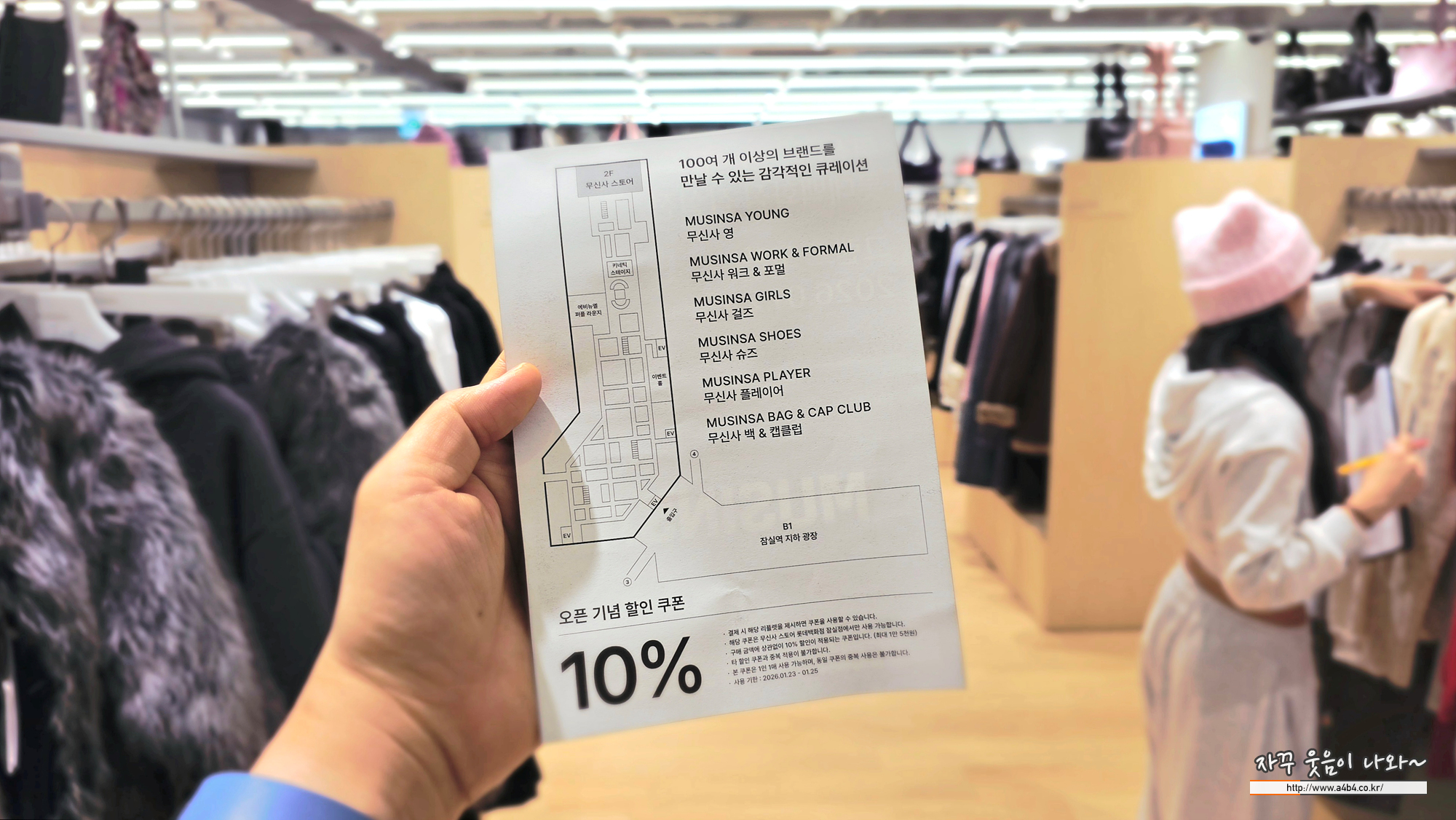 무신사스토어 잠실 오픈 기념으로 오픈 3일간 잠실역 지하광장 트레비 분수 인근에서 빅사이즈 쇼핑백 착용한 프로모터를 마주친다면 매장 추가 할인이 가능한 10% ~ 20% 쿠폰을 받을 수 있습니다.