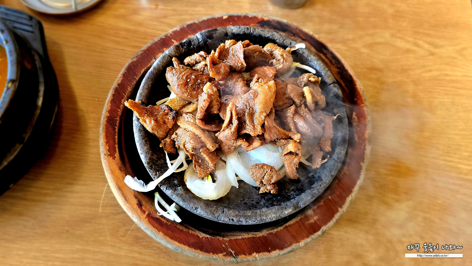 주문하면 매장 입구에서 직화로 돼지구이 만들어 주십니다. 달군 돌판위에 썬양파를 올리고 그 위에 돼지구이를 올려주시네요.