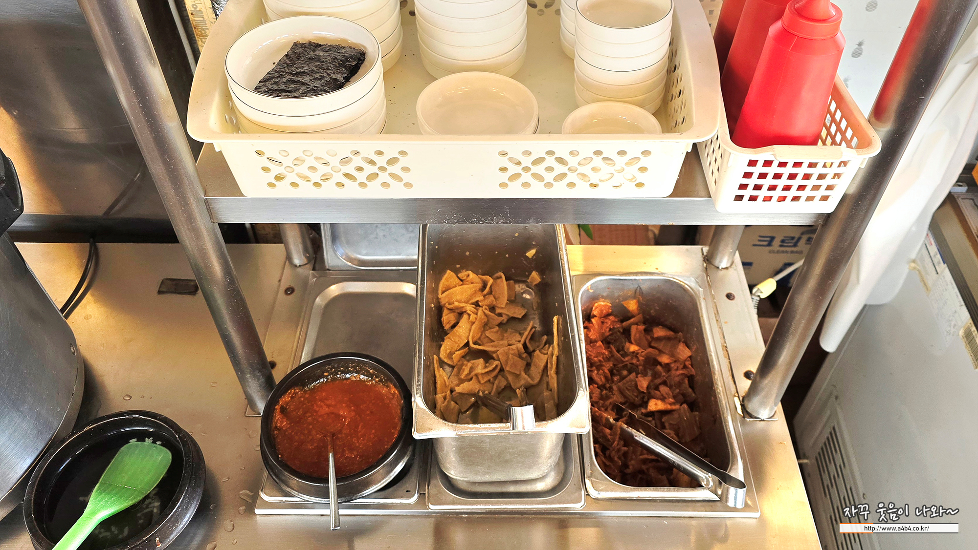 장꼬방 반찬은 김과 어묵, 묵은지가 나오고요. 셀프코너에서 리필 가능합니다.
