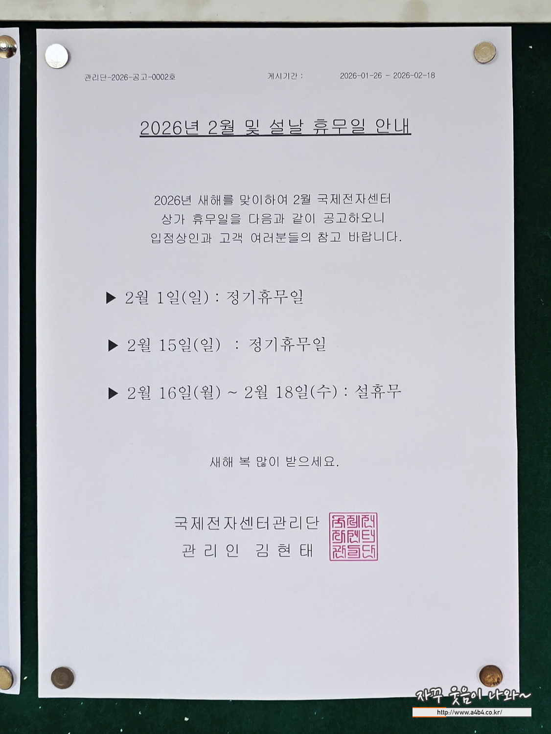 3주차 일요일인 정기휴무일과 함께 2월 15일 일요일 부터 18일 수요일까지가 국제전자센터 설 연휴 휴일 입니다.
