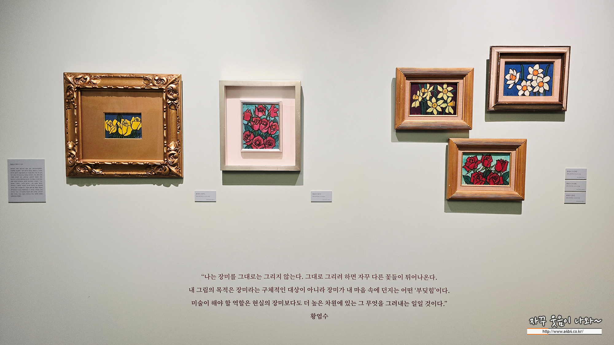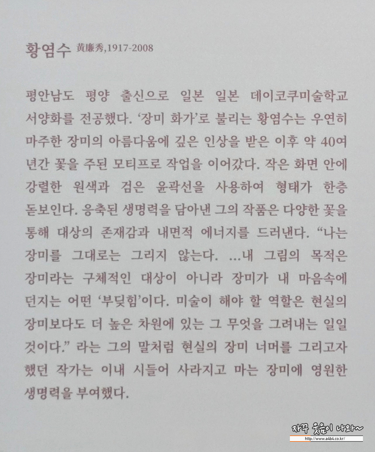 평생에 걸쳐 장미라는 하나의 소재에 집요하게 매달려 자신만의 예술 세계를 완성한 것으로 유명합니다. 앞서 언급하신 이대원, 윤중식, 임직순 작가들이 색채를 통해 자연과 서정을 노래했다면, 황염수 작가는 '장미'라는 구체적인 대상을 통해 강렬한 조형미와 생명력을 탐구했습니다.