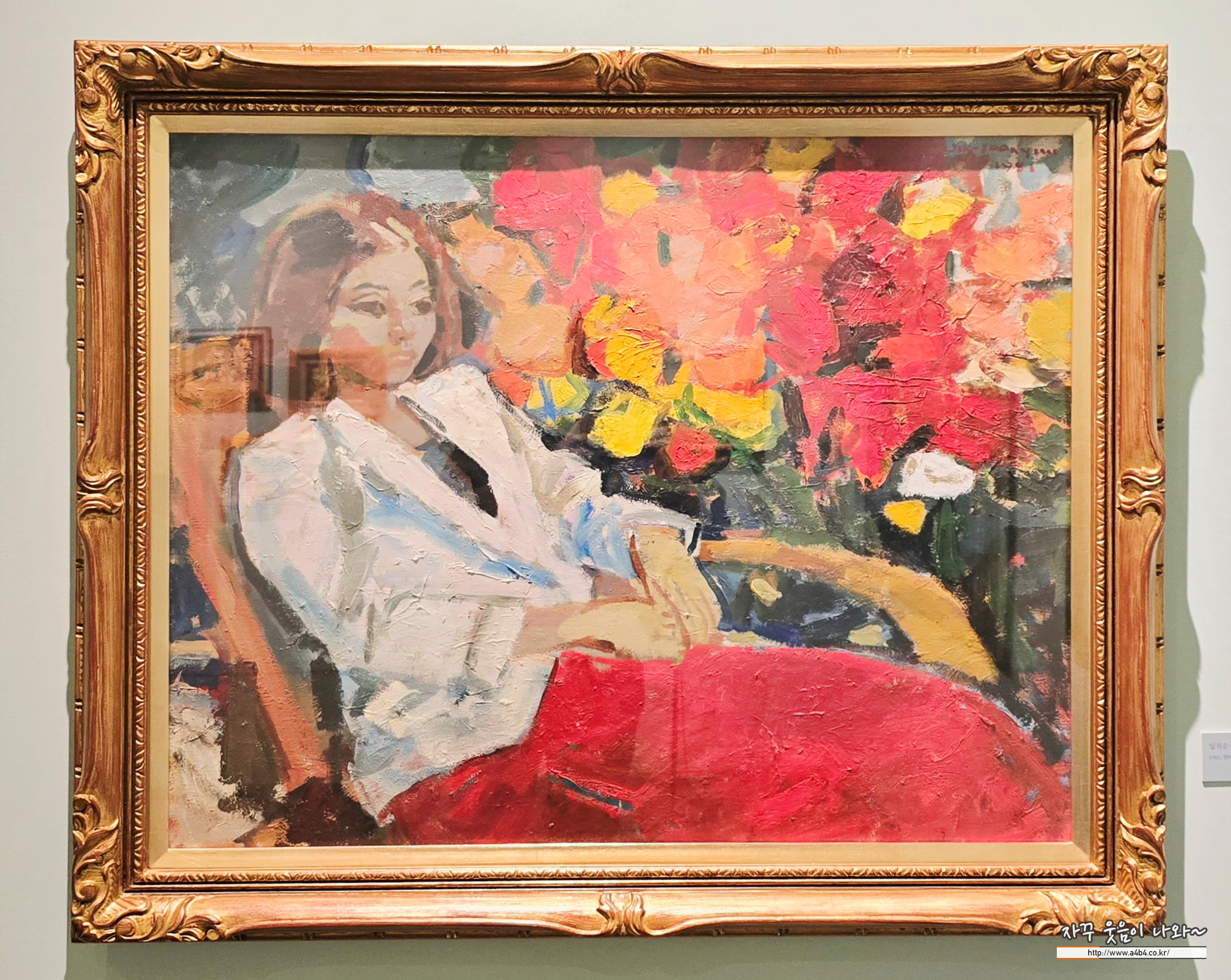꽃과 여인은 임직순 화가가 가장 즐겨 그린 소재입니다. 화면 가득 피어난 꽃과 그 곁에 앉아 있는 여인을 통해 평화롭고 서정적인 분위기를 연출합니다.