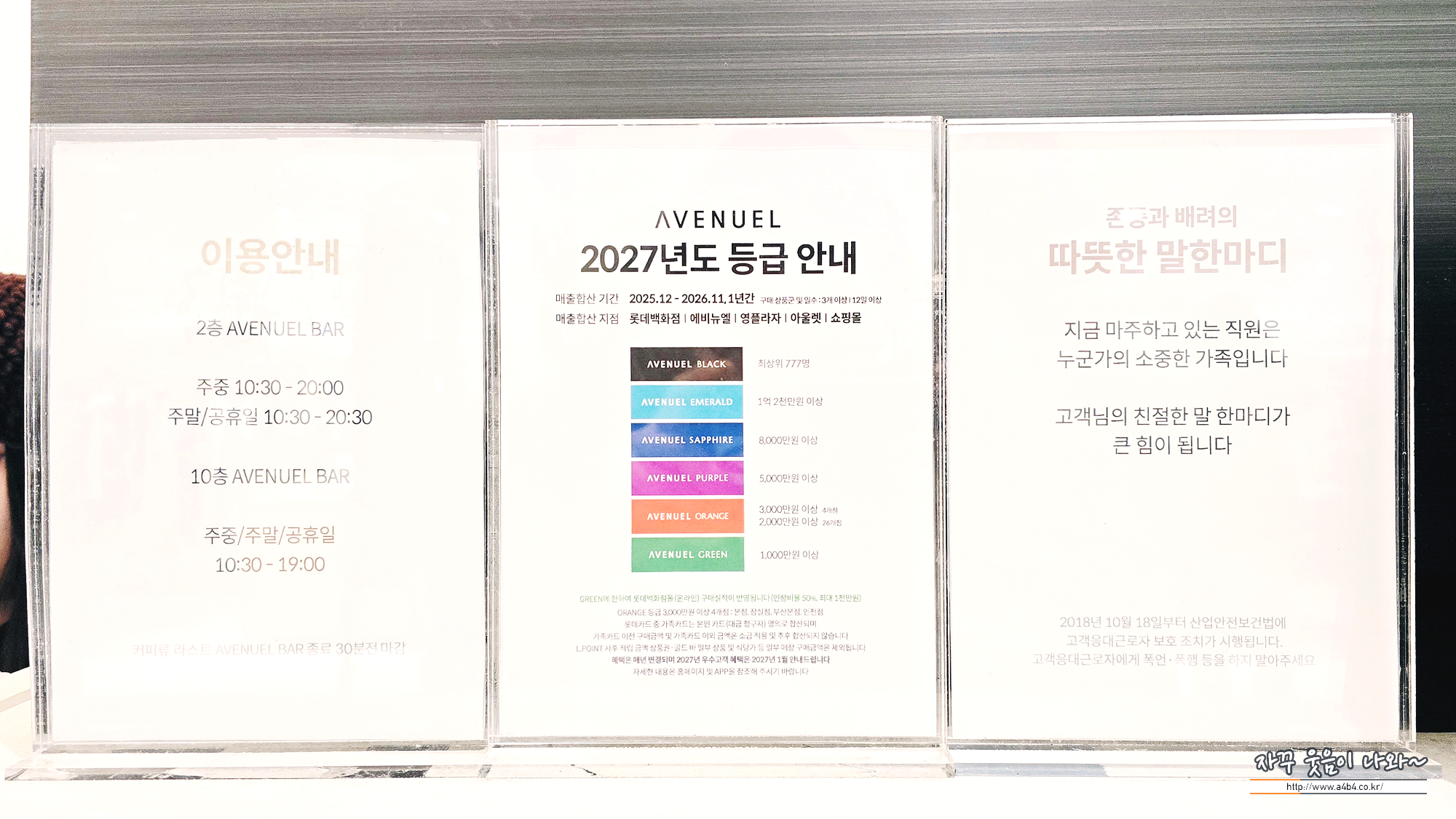 롯대백화점은 최상위 777명 블랙 등급부터 그린까지 6개의 등급이 있고요. 등급에 따라 에비뉴엘 라운지 이용 및 무료주차 가능합니다. 또한 라운지를 이용할 수 있거나 단순히 음료 테이크아웃만 가능하기도 하니 롯데백화점 등급 확인하시고 방문하세요.
