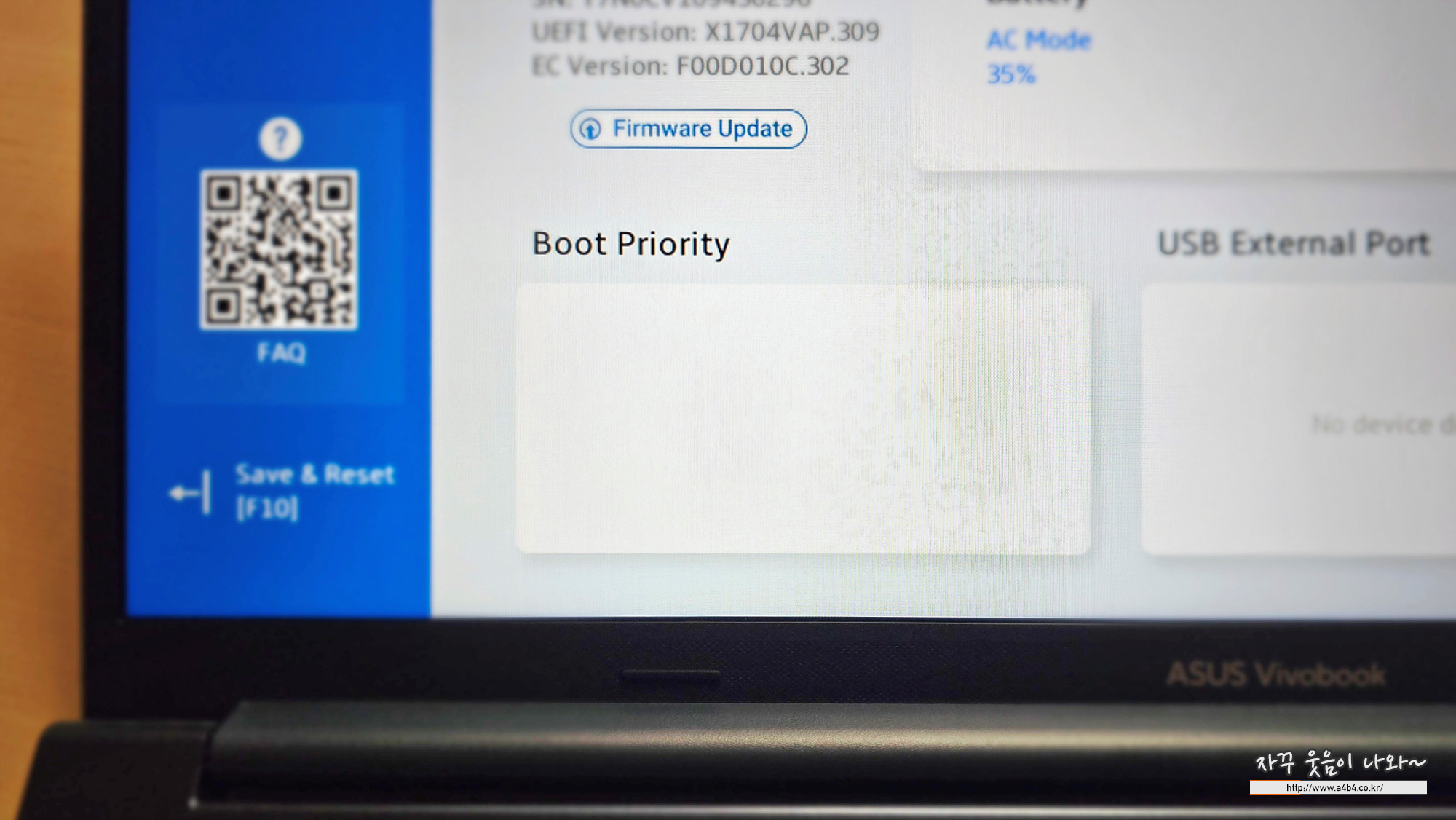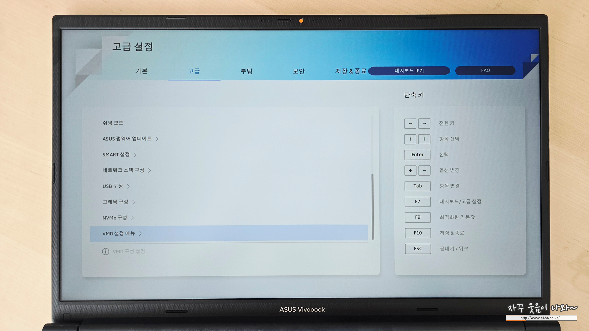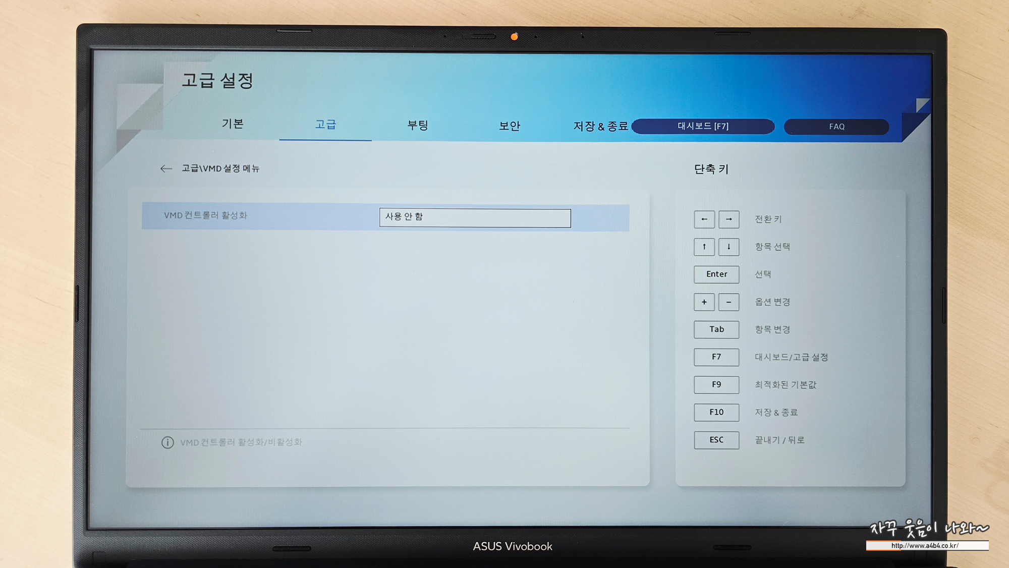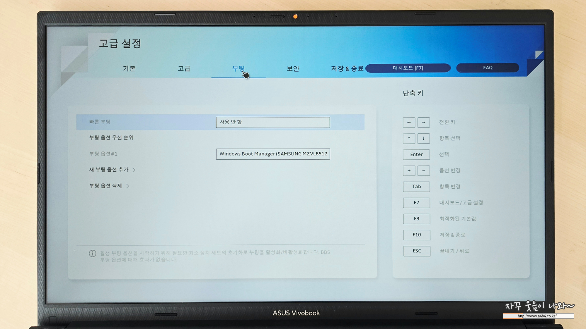 변경 후 아수스 비보북 윈도우 설치 USB 메모리를 삽입하고, 노트북 재부팅 합니다. (설정값 저장)