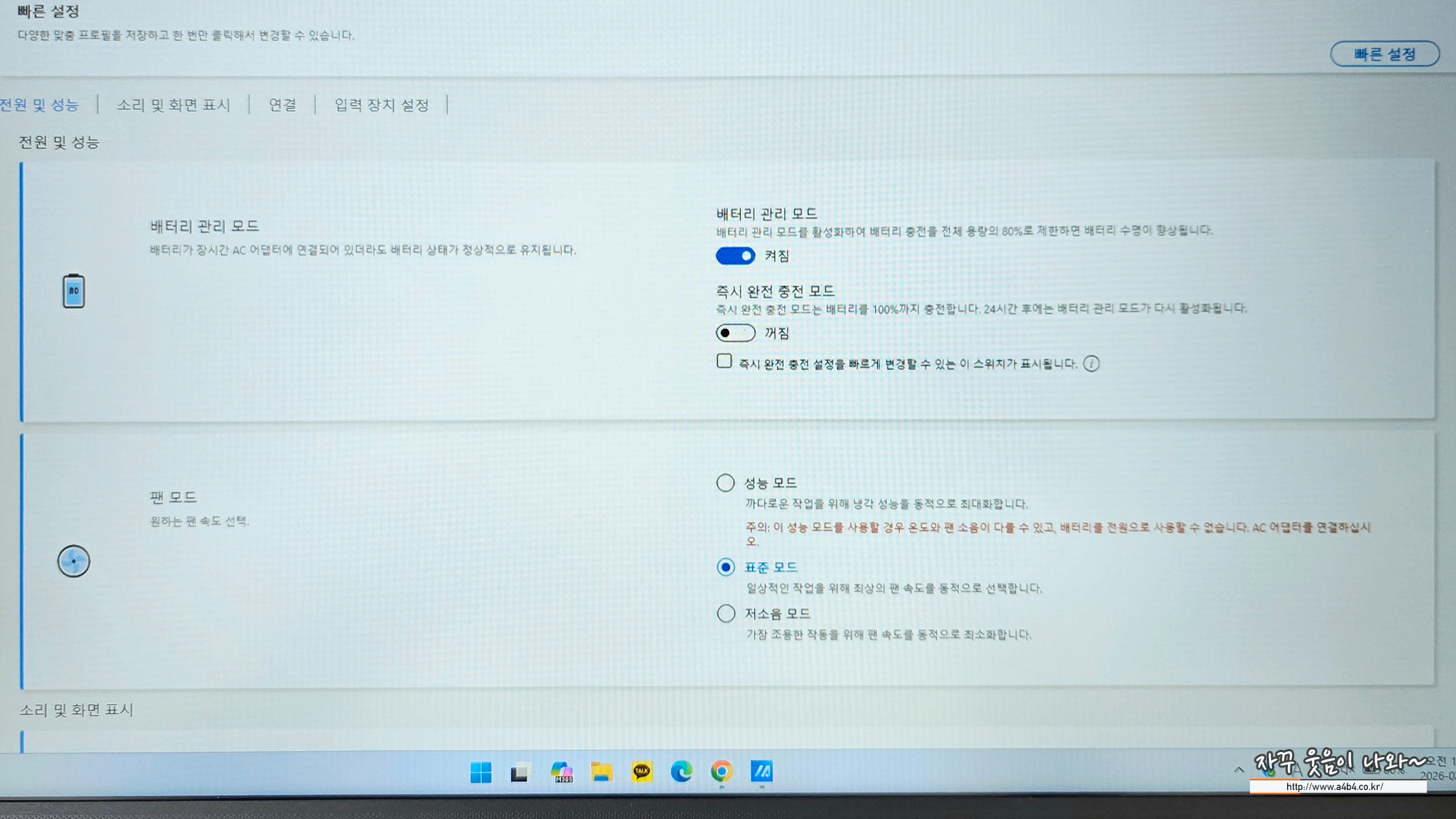 노트북 배터리는 100% 완충 상태로 사용하면 장기간 배터리 성능이 절반정도 수준으로 떨어진다고 하는데요. 이곳 에이수스 배터리 관리 모드에서 해당 기능을 활성화 하면 최대 배터리 충전이 80%에서 차단되어 배터리 수명을 향상시킵니다.