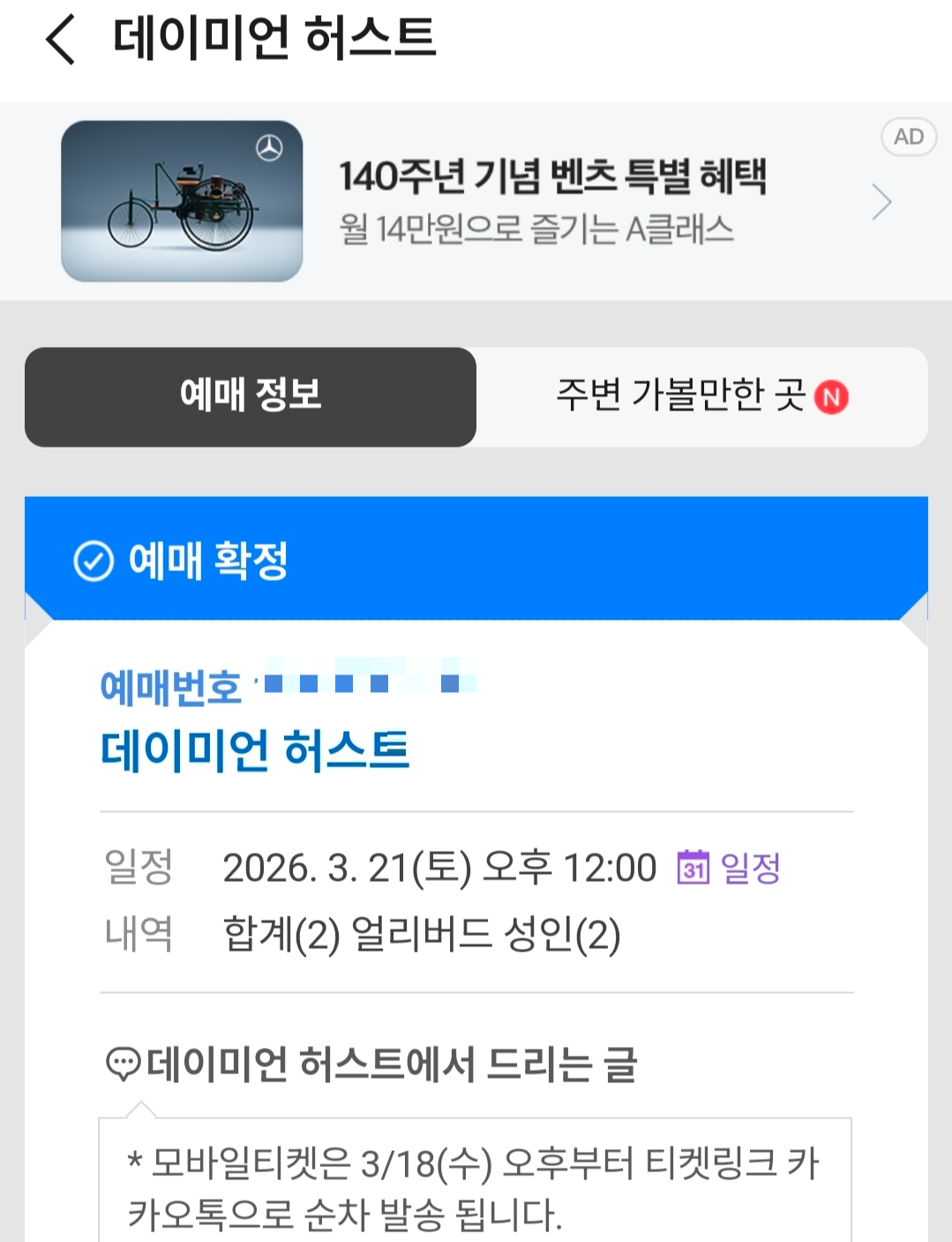 저는 티켓오픈 당일만 진행된 50% 할인 얼리버드 티켓팅 성공 했네요.!!!