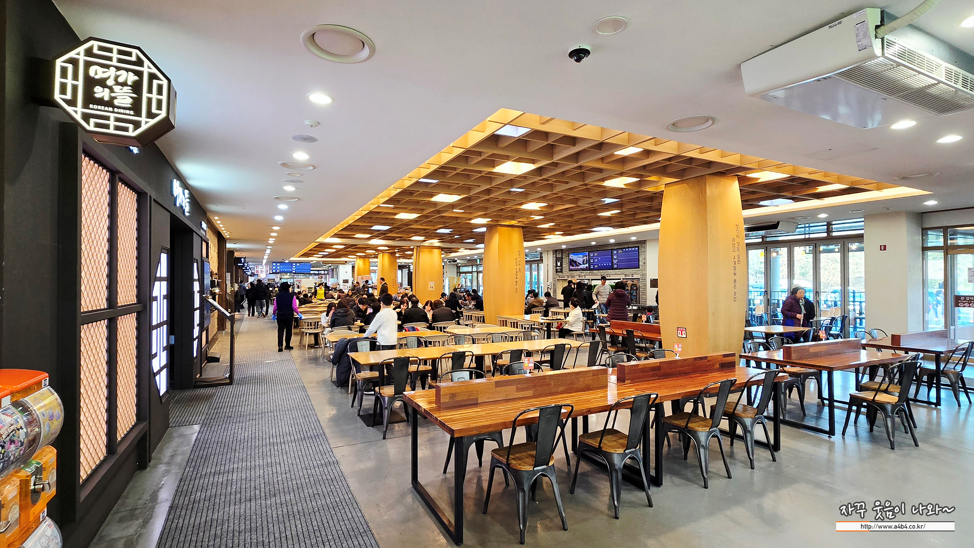 푸드코트 실내는 중규모 사이즈입니다. 다만 식당과 상품 판매점이 분리되어 있지 않고 같이 있어서 다소 소란스러운 분위기, 조금은 편하고 고급지게 식사하고 싶으시면 아래 사진 왼쪽 경기도 광주휴게소 명가의 뜰 맛집에서 식사하시는 것 추천 드립니다.