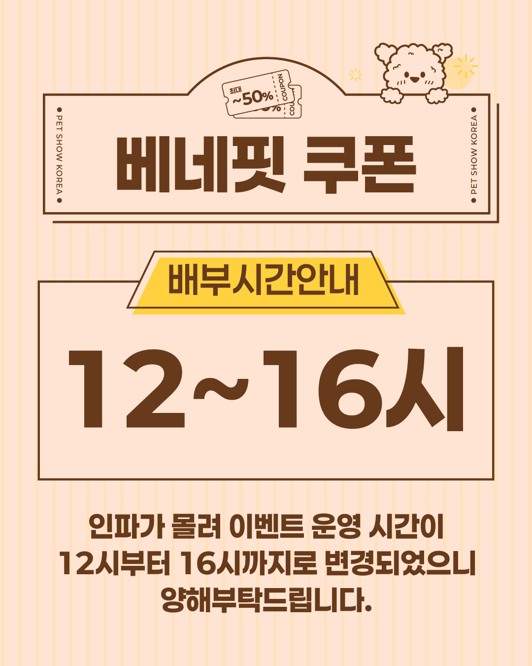 펫쇼 행사의 재미는 저렴한가격에 댕댕이 용품 구입할 수 있는 부분도 있지만, 다양한 경품이벤트와 쿠폰 받는 재미도 쏠쏠 한데요. 10시 30분에 방문했을때 행사장 로비 베네핏 쿠폰은 모두 품절되었는데요.