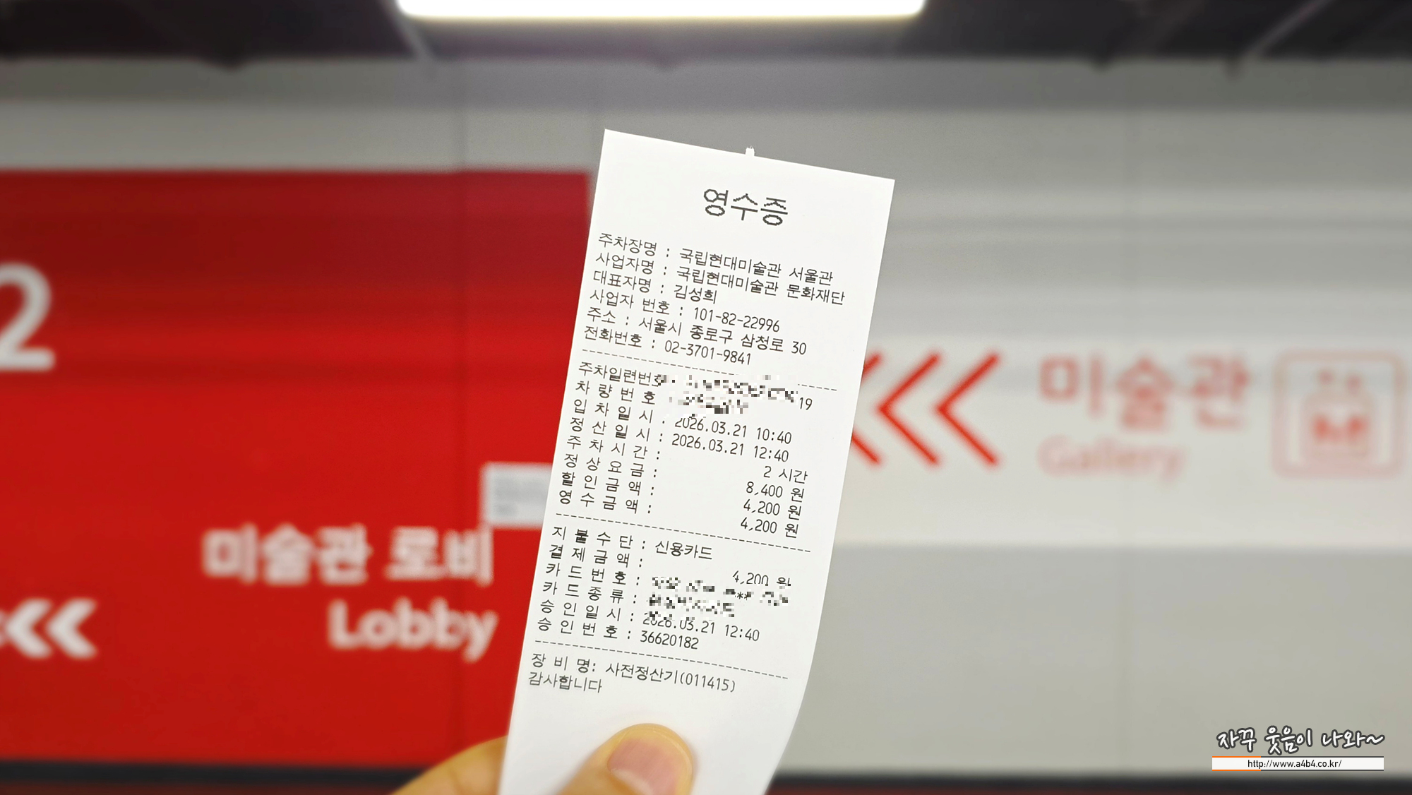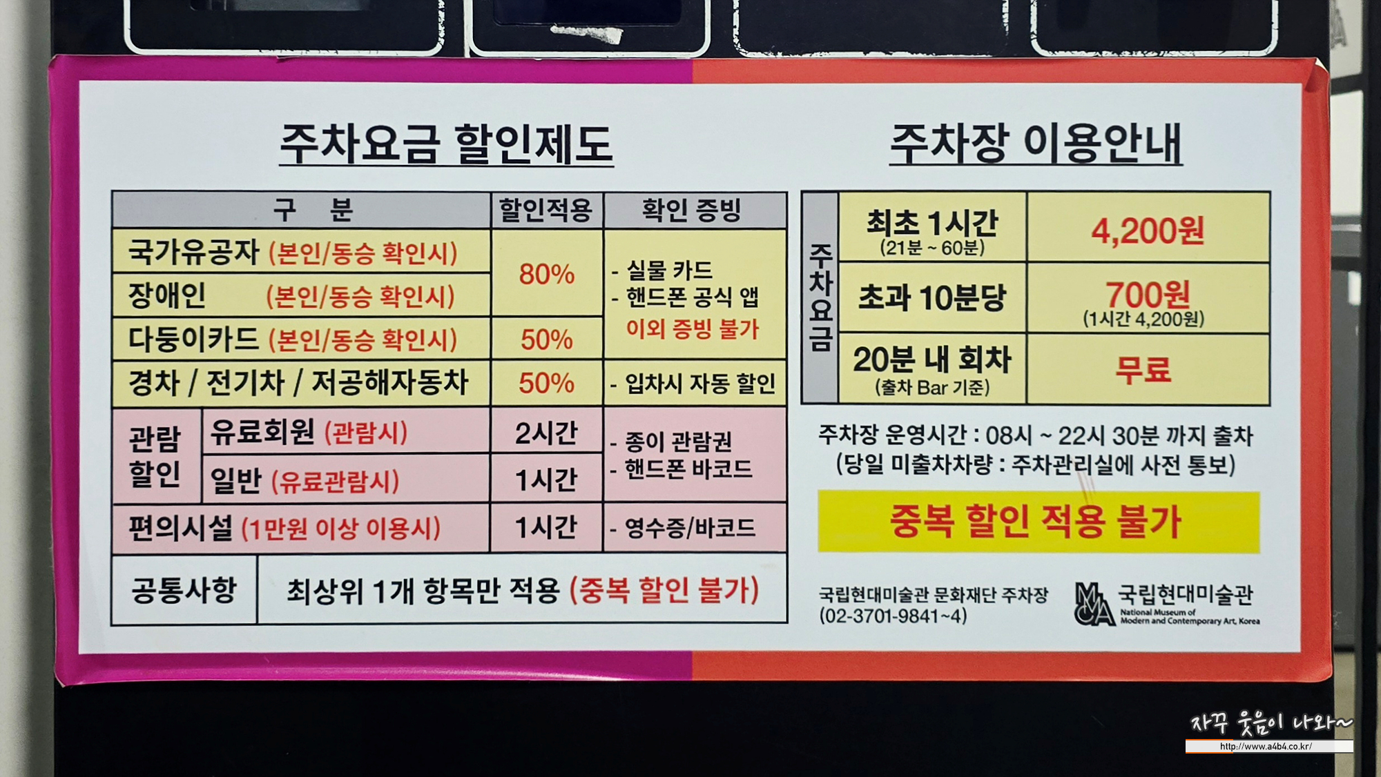 국립현대미술관 주차요금은 최초 1시간 4,200원, 이후 10분당 700원 주차요금 부과됩니다. 20분 이내 회차시 국립현대미술관 서울 주차요금 무료지만, 20분 내에 관람은 뭐...