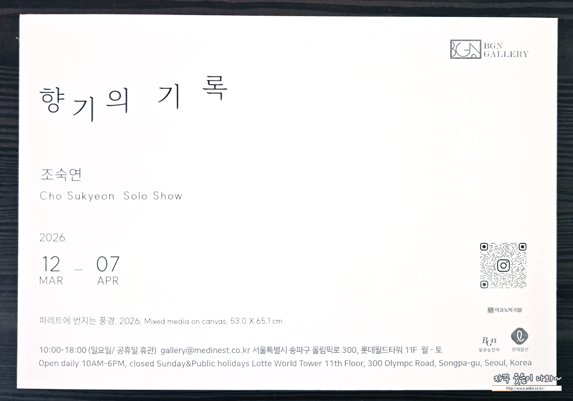 BGN Gallery에서 열리고 있는 조숙연 작가 개인전 '향기의 기록' 전시회 관람후기입니다.