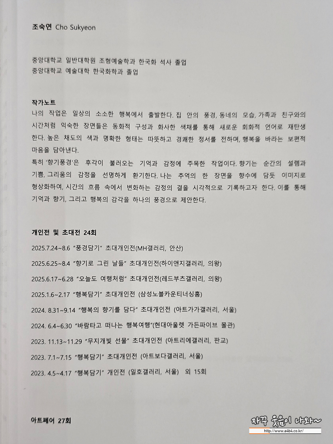 조숙연 작가는 중앙대학교 일반대학원 조형예술학과 한국화 석사 졸업하고 중앙대학교 예술대학 한국화학과 졸업한 작가입니다. 24회의 개인전 및 토대전, 아트페어 27회 참여한 현재 활발하게 작품활동을 진행하고 있는 작가입니다.