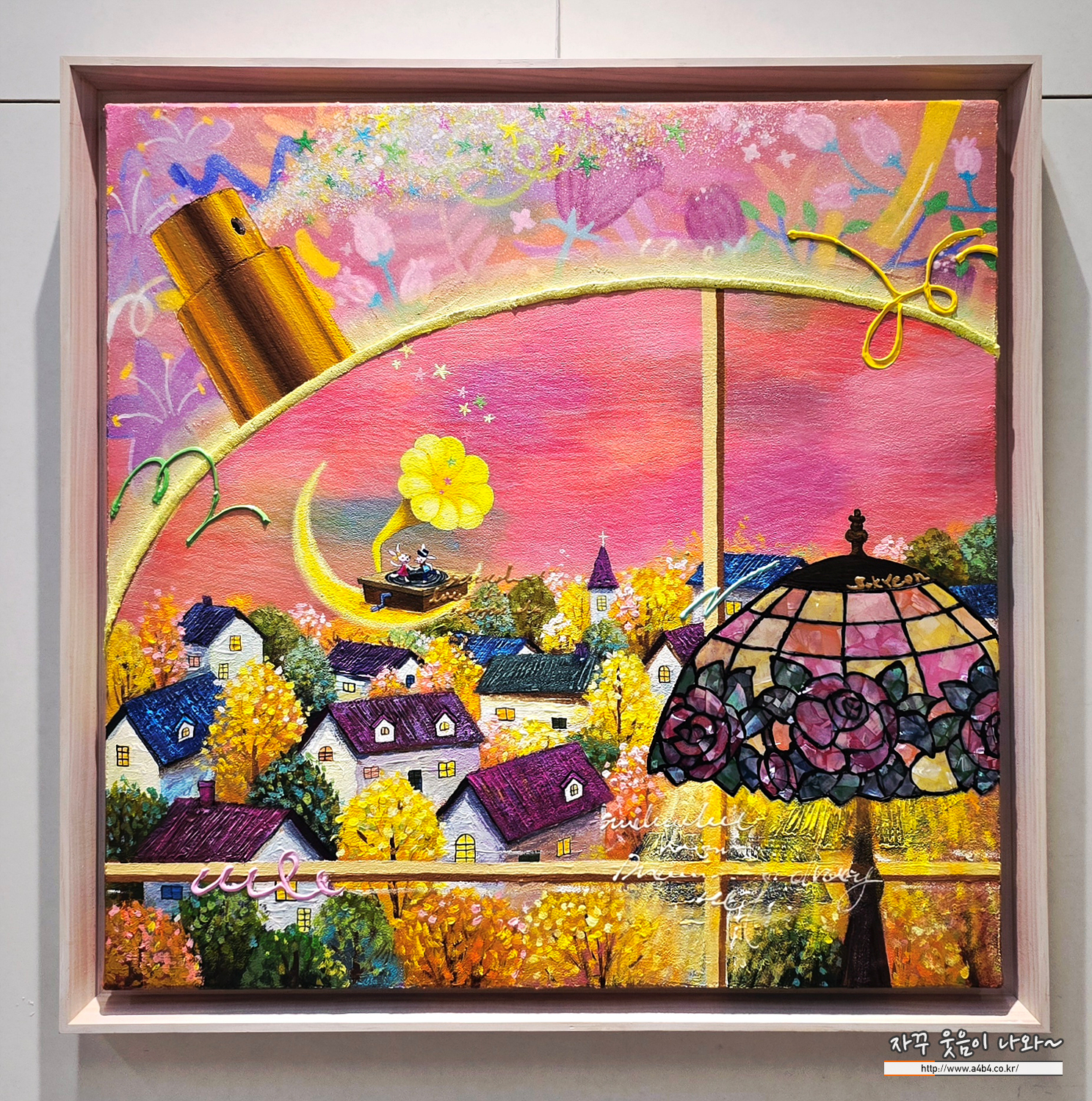 조숙연은 이러한 기억의 시간을 ‘향수병’이라는 형식을 통해 시각화합니다. 작가는 향수병의 형태를 크게 화면에 두고 그 안에 풍경과 인연의 순간들을 담아냅니다. 선명한 형태와 높은 채도의 색채로 구성된 장면들은 동화적인 분위기를 만들어내며 화면 속 다양한 요소들은 경쾌한 움직임과 밝은 리듬 속에서 밝고 생동감 있는 세계를 펼쳐 보입니다.