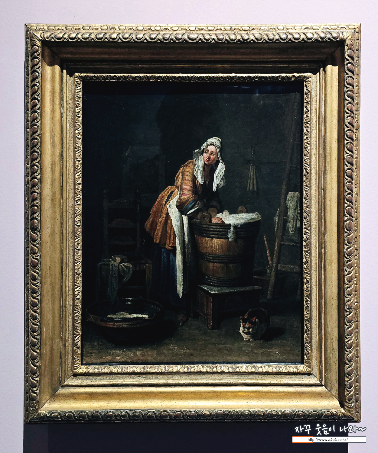 세탁하는 여인과 저수통에서 물 받는 여인은 실내에서 소박한 집안일을 하는 하인을 주제로 한 쌍의 작품입니다. 전자는 빨래를 하다 잠시 주의를 빼앗긴 듯한 여인을 담고 있으며, 후자는 구리 저수통에서 물을 받는 여인의 옆모습과 고기 덩어리를 묘사합니다. 두 장면은 친밀한 실내 분위기, 재질에 따른 빛의 효과, 절제된 색채가 조화를 이루며 샤르댕이 17세기 네덜란드 회화의 영향을 자신만의 방식으로 흡수했음을 보여줍니다.