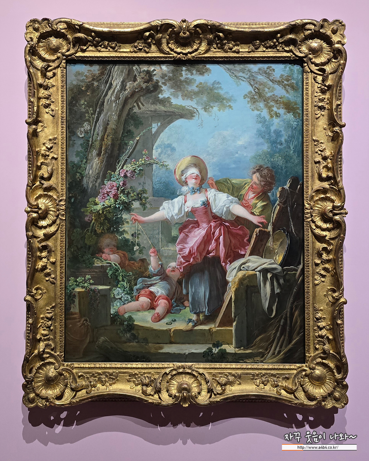 까막잡기 놀이는 프라고나르가 즐겨 그린 연애 놀이 장르의 대표작으로, 18세기 유럽 귀족 문화에서 구애와 우연을 상징하는 유희를 담고 있습니다. 경쾌한 필치로 정원에서의 한때를 그려낸 이 작품은 곳곳에 봄꽃을 배치해 사랑의 덧없는 속성을 시각화했습니다. 연인이 지푸라기로 여인의 뺨을 간지럽히고 아이가 손을 건드리는 유희적 몸짓은 시선을 욕망의 대상으로 유도하거나 분산시키려는 의도를 담고 있습니다.