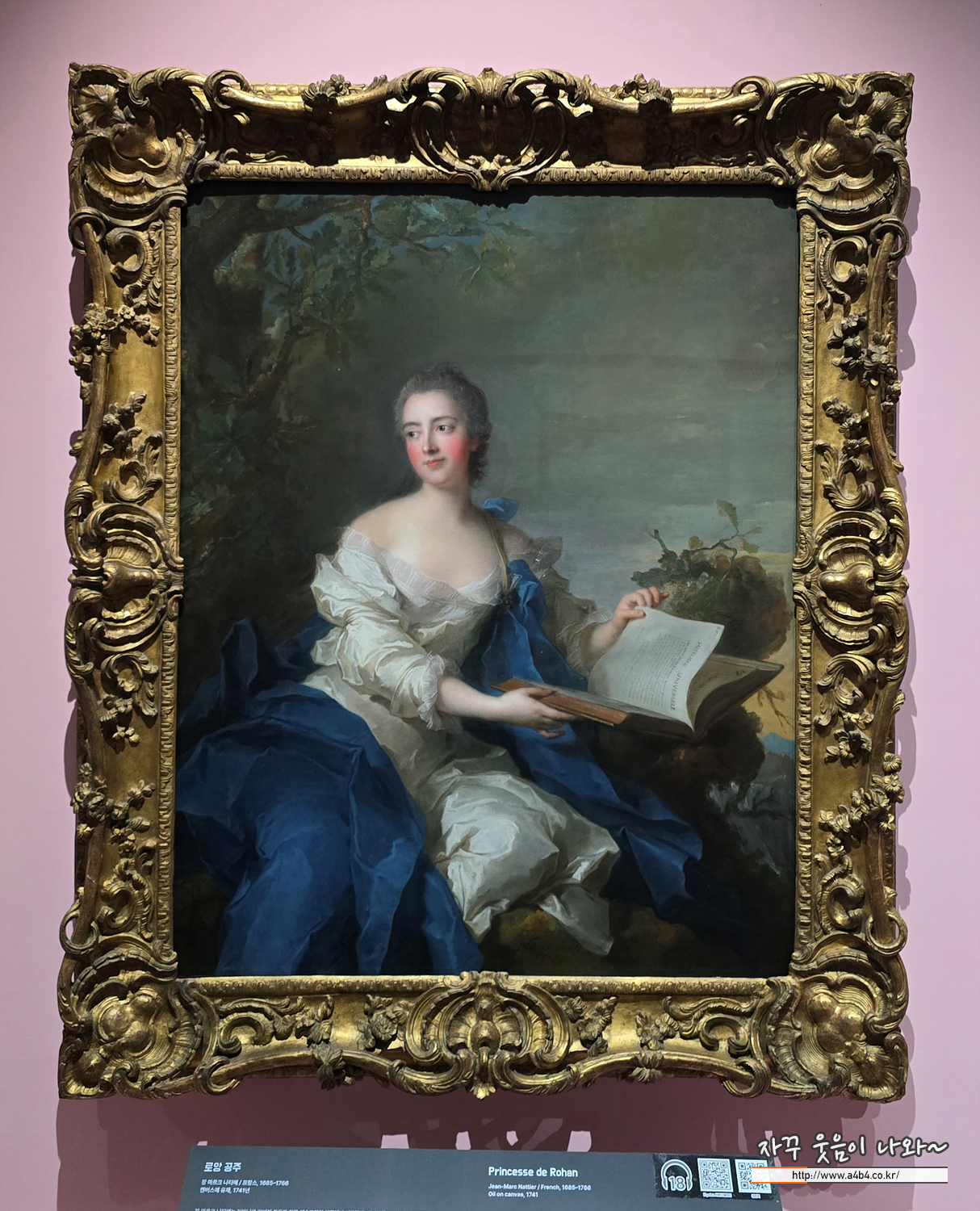 나티에의 로앙 공주는 로코코 귀족 문화의 미적 이상을 집약한 알레고리 초상화입니다. 높은 학식으로 살롱을 주재했던 로앙 공녀를 학문의 뮤즈로 형상화하기 위해 세계사 책을 든 모습으로 묘사했습니다. 단순한 의상과 자연스러운 배경은 인물의 우아함을 더욱 돋보이게 합니다.