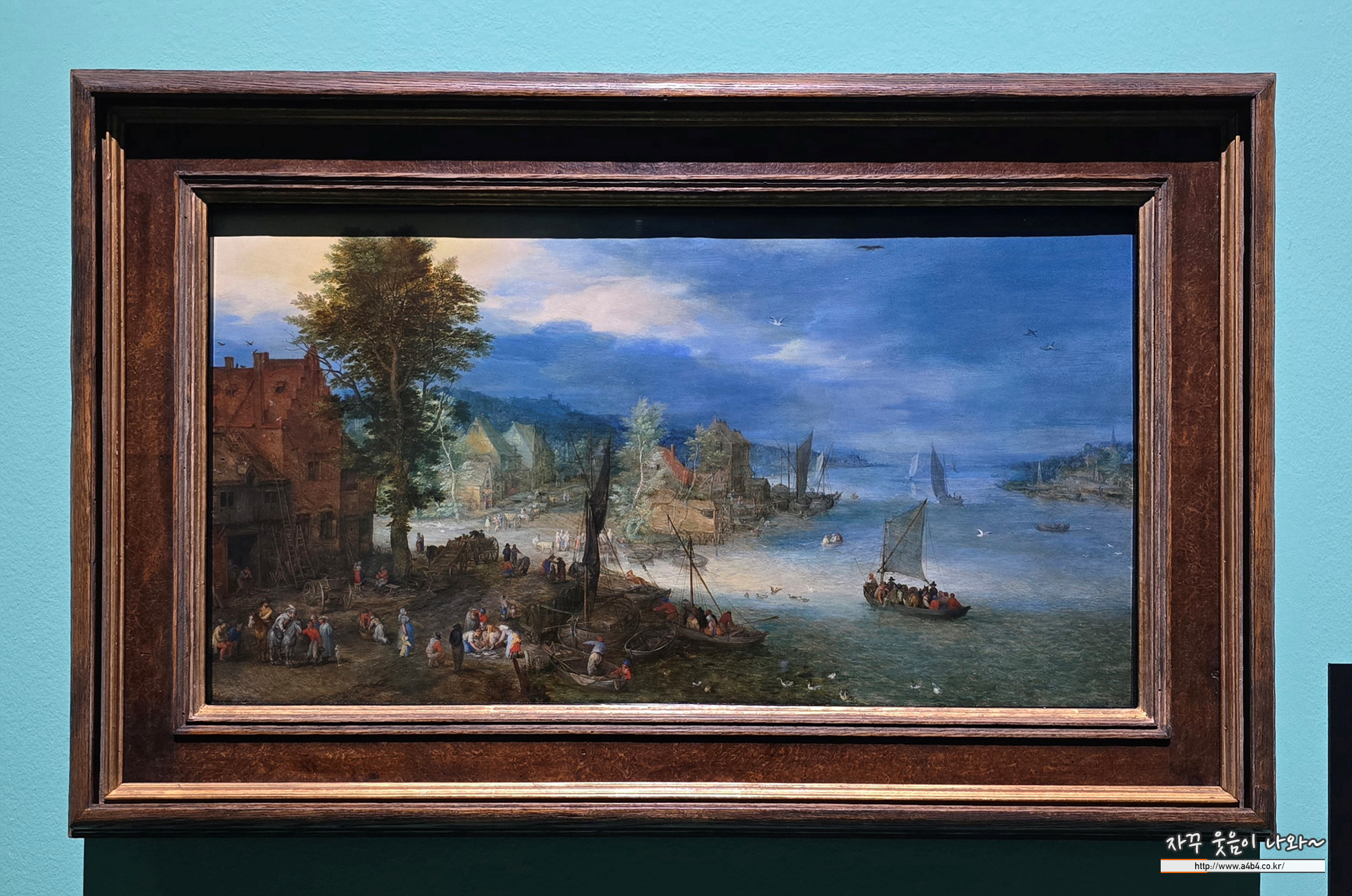 강가 마을에서 먼 항구로 이어지는 넓은 시야는 자연과 인간의 조화로운 관계를 리듬감 있게 보여줍니다. 엷은 안개와 푸른빛이 어우러진 평온한 대기감은 작품 전체에 서정성을 더합니다. 전경의 어두운 갈색조가 배경으로 갈수록 옅어지는 구성은 시선을 바다로 유도합니다. 특히 청록색 바다와 하늘이 맞닿는 독보적인 원근법과 공간 표현은 브뤼헐의 명성을 확립해 준 핵심 화풍입니다.