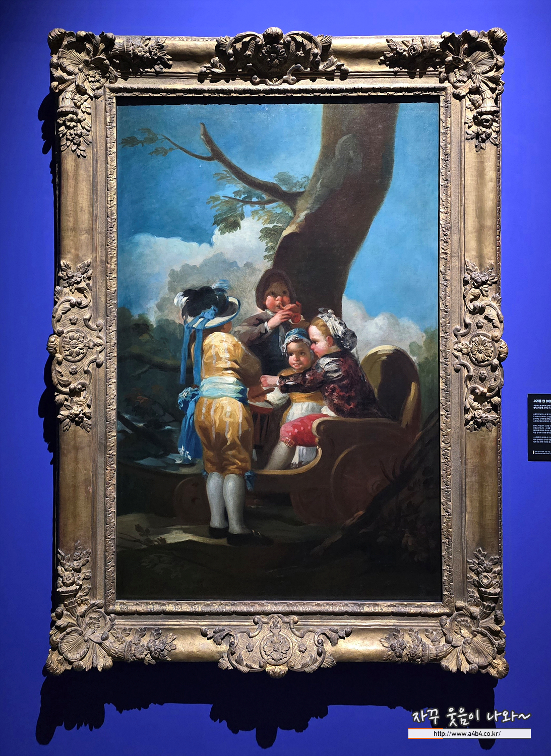 스페인 근대 회화의 선구자 고야는 1770년대 왕립 태피스트리 공장의 밑그림 제작을 통해 궁정 화가로 입지를 굳혔습니다. 수레를 탄 아이들은 파르도 궁전 장식을 위해 제작된 카르톤 연작 중 하나로, 한동안 말린 채 보관되다 1870년에 이르러서야 그 가치를 재발견하게 되었습니다. 이 작품은 태피스트리 원본 그림이라는 특성상 오랫동안 빛을 보지 못했으나, 오늘날 고야의 초기 예술적 기반을 보여주는 중요한 사례로 평가받습니다. 고야의 밑그림을 바탕으로 완성된 태피스트리는 지금도 파르도 궁전에 남아 역사적 자리를 지키고 있습니다.