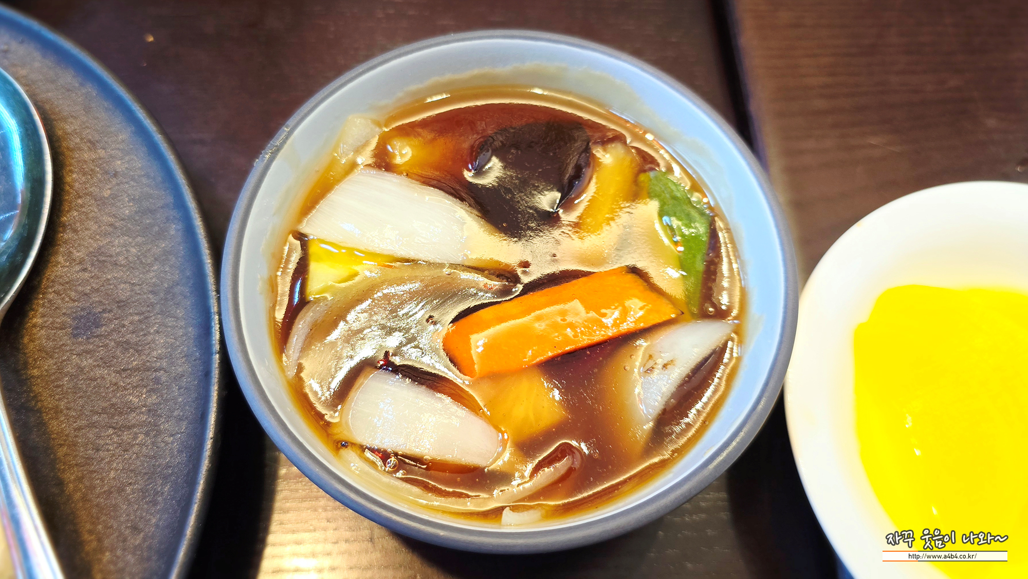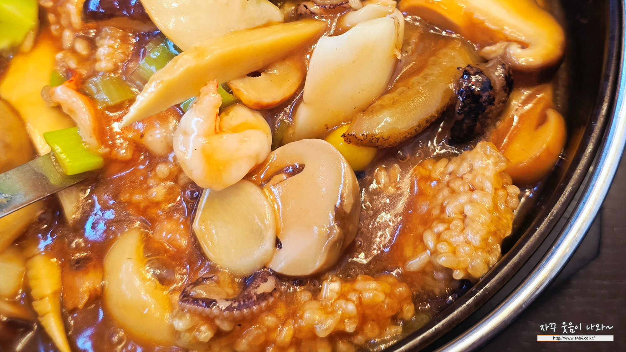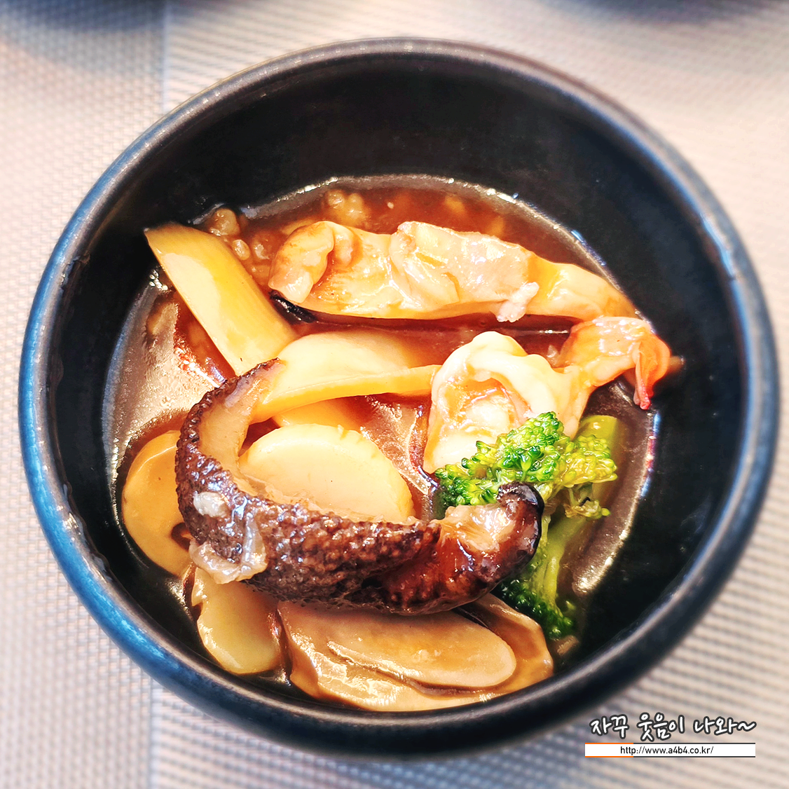 오징어, 죽순, 버섯, 브로컬리, 새우등이 들어 있고요. 전복도 들어있기는 한데, 작은 것 반 마리 정도 들어있는 것 같네요. 전복 조각은 찾기 어려워요. 여러 단물요리 주문했지만 5명이 나누어 먹기에는 다소 적은 양이네요. 2~3명 먹기에 충분...